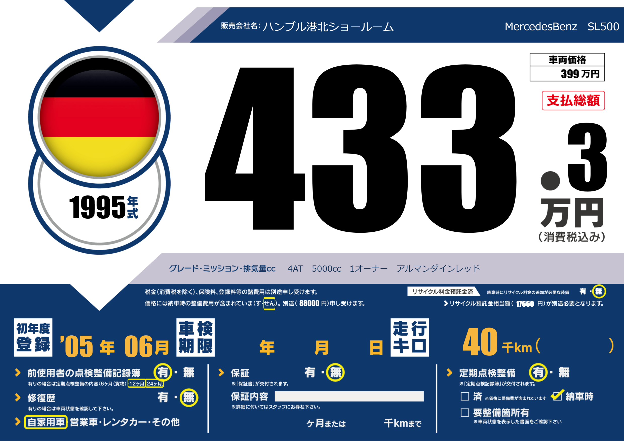 | 車名 | MercedesBenz SL500 | グレード ミッション 排気量 |