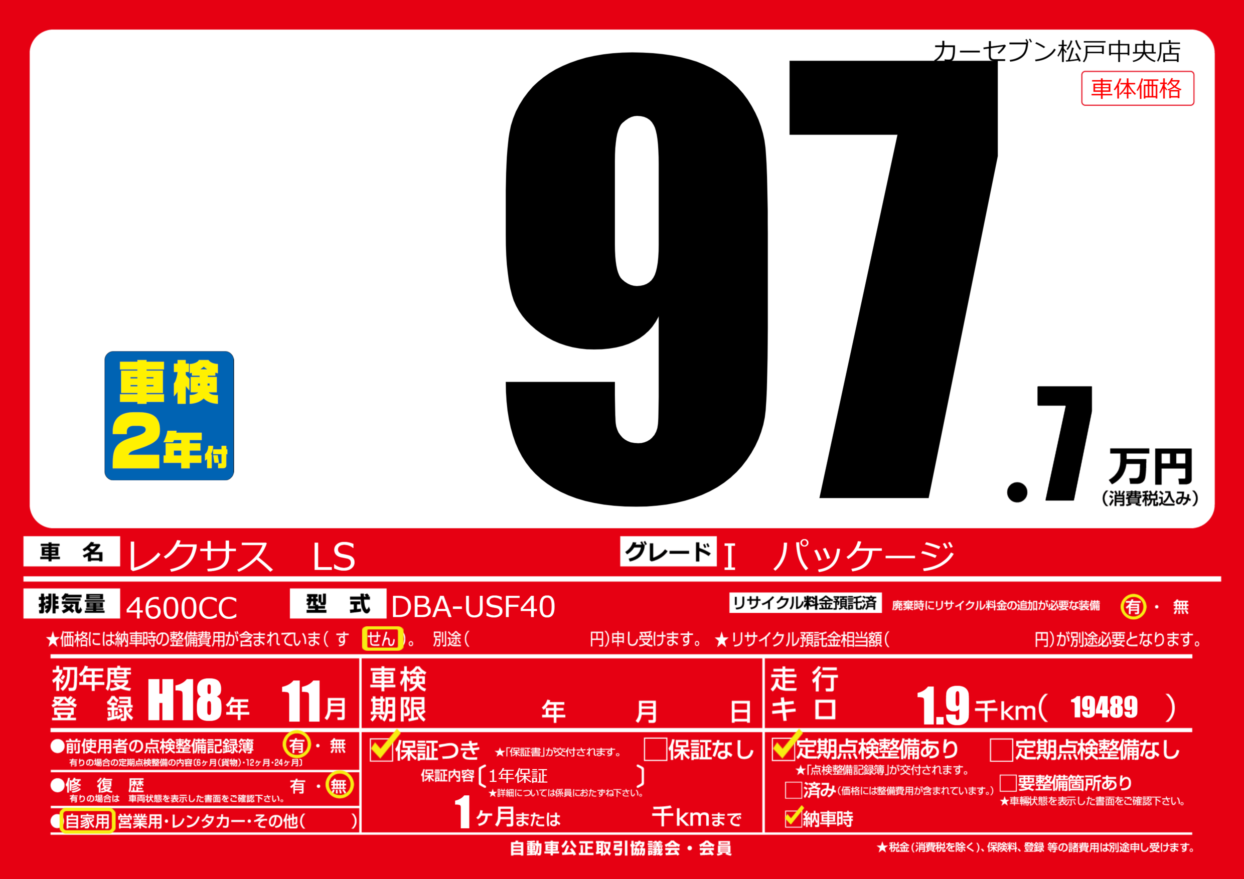 | 車名 | レクサス LS | グレード ミッション 排気量 |