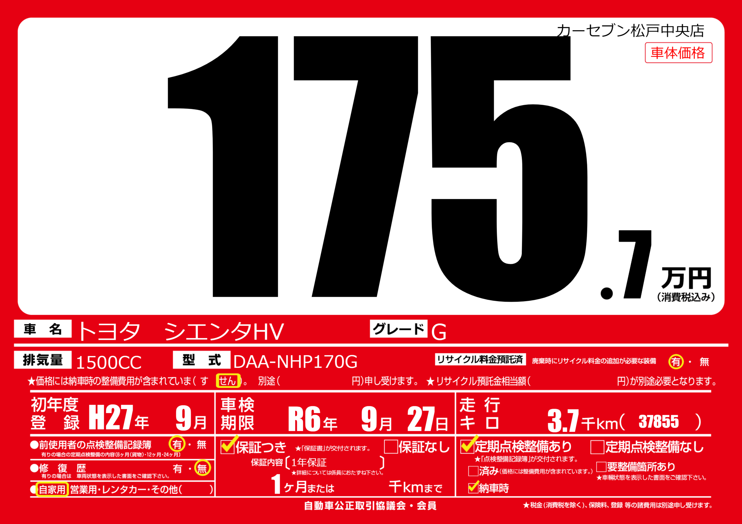 | 車名 | トヨタ シエンタHV | グレード ミッション 排気量 |