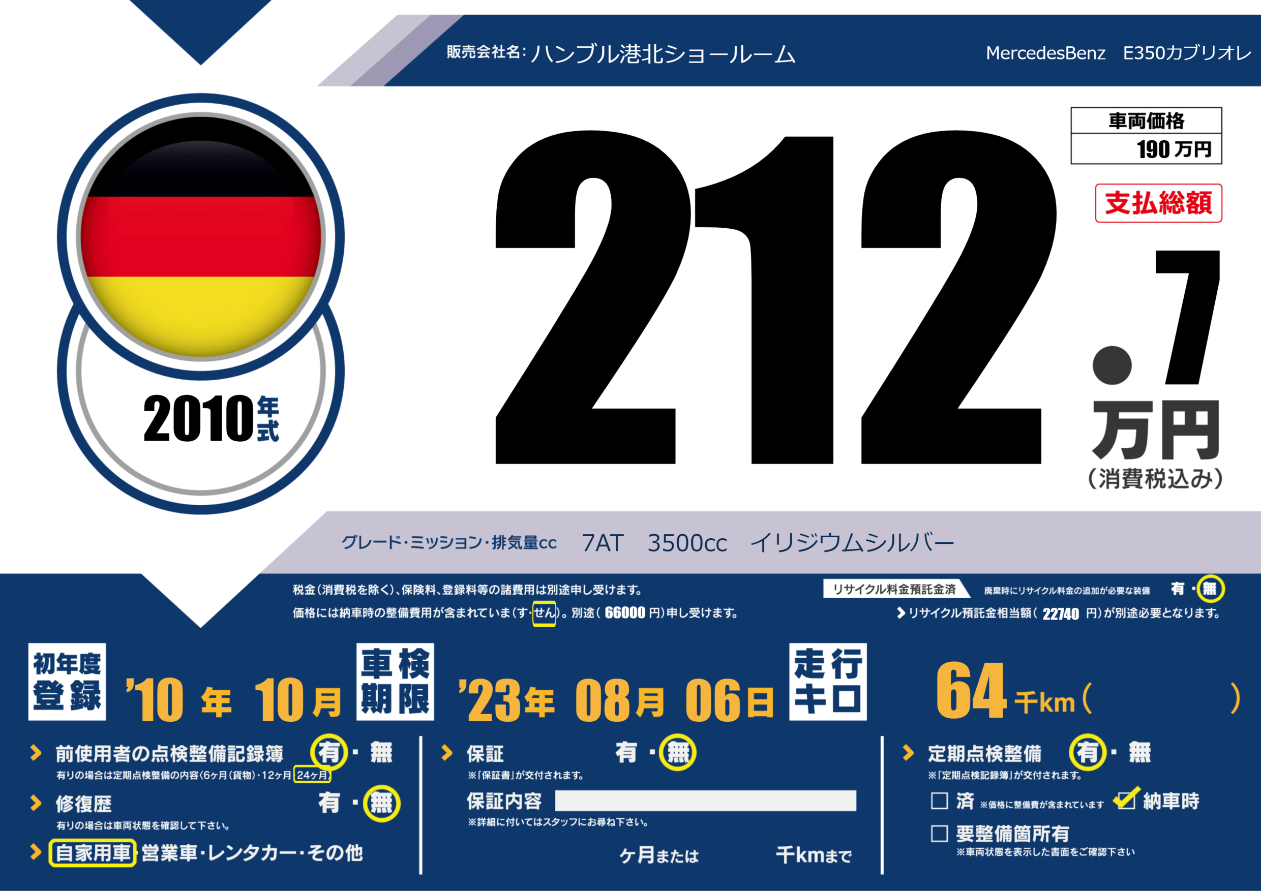 | 車名 | MercedesBenz E350カブリオレ | グレード ミッション 排気量 |