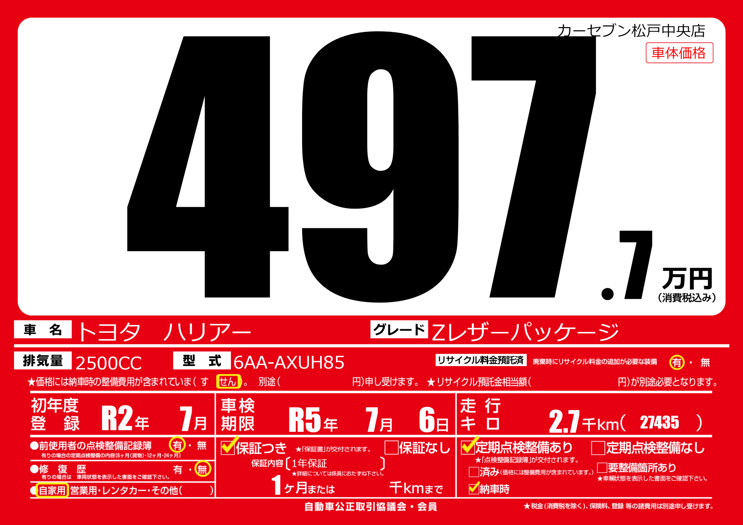 | 車名 | トヨタ ハリアー | グレード ミッション 排気量 |