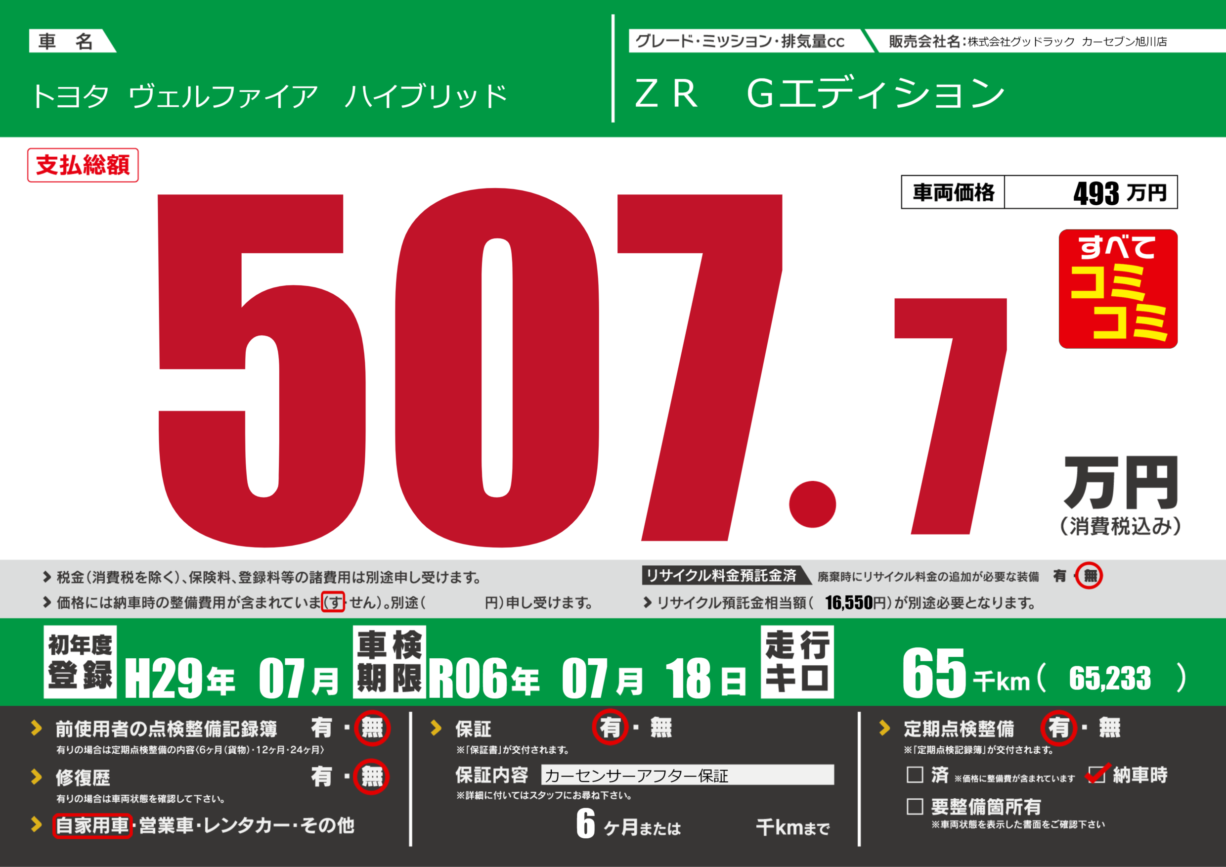 | 走行キロ | 6.5万km | 初年度登録 | H29年07月 |