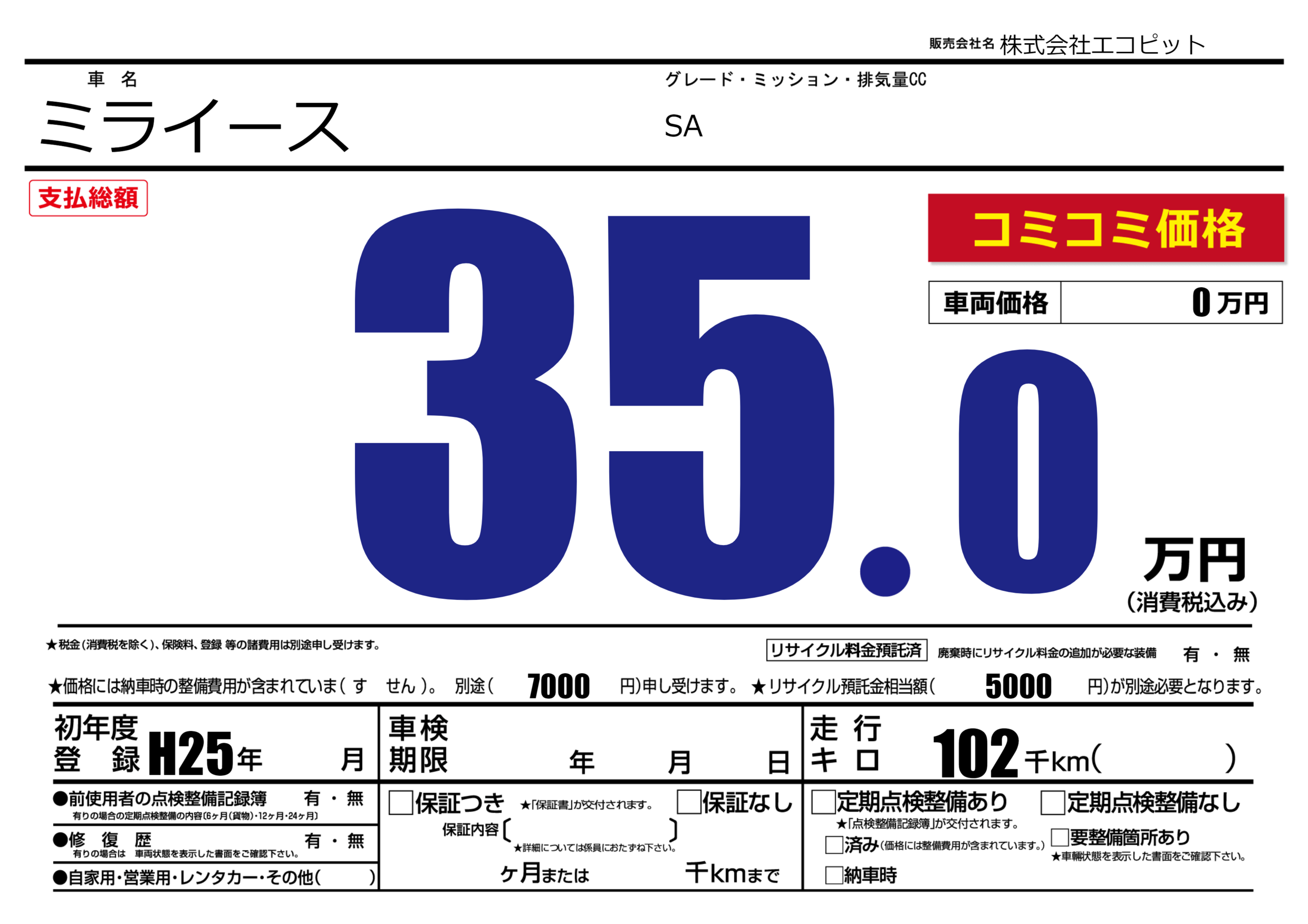 なし | リサイクル預託金相当額 | ( 1円)が別途必要 |