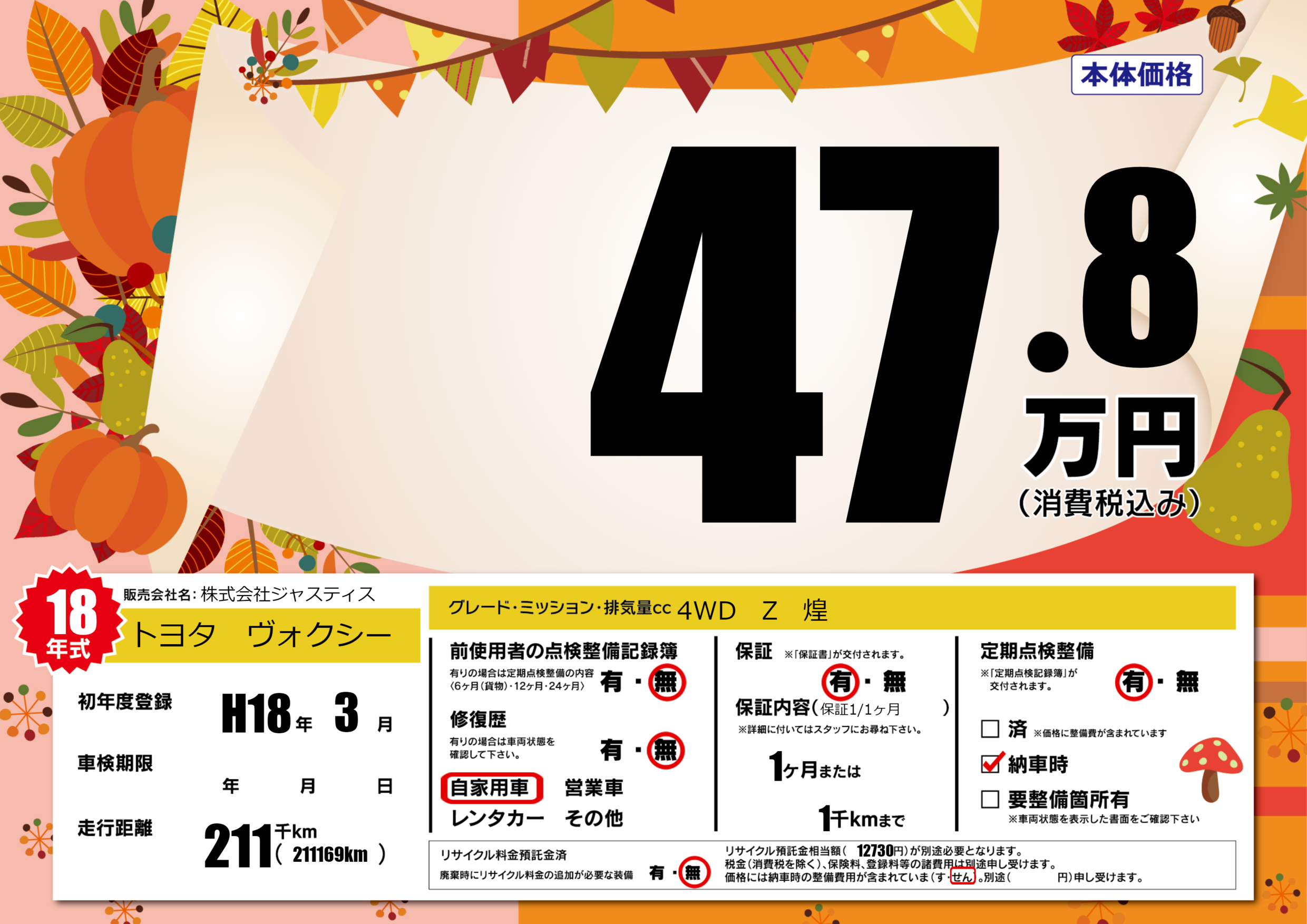 | 走行キロ | 21.1万km | 初年度登録 | H18年3月 |