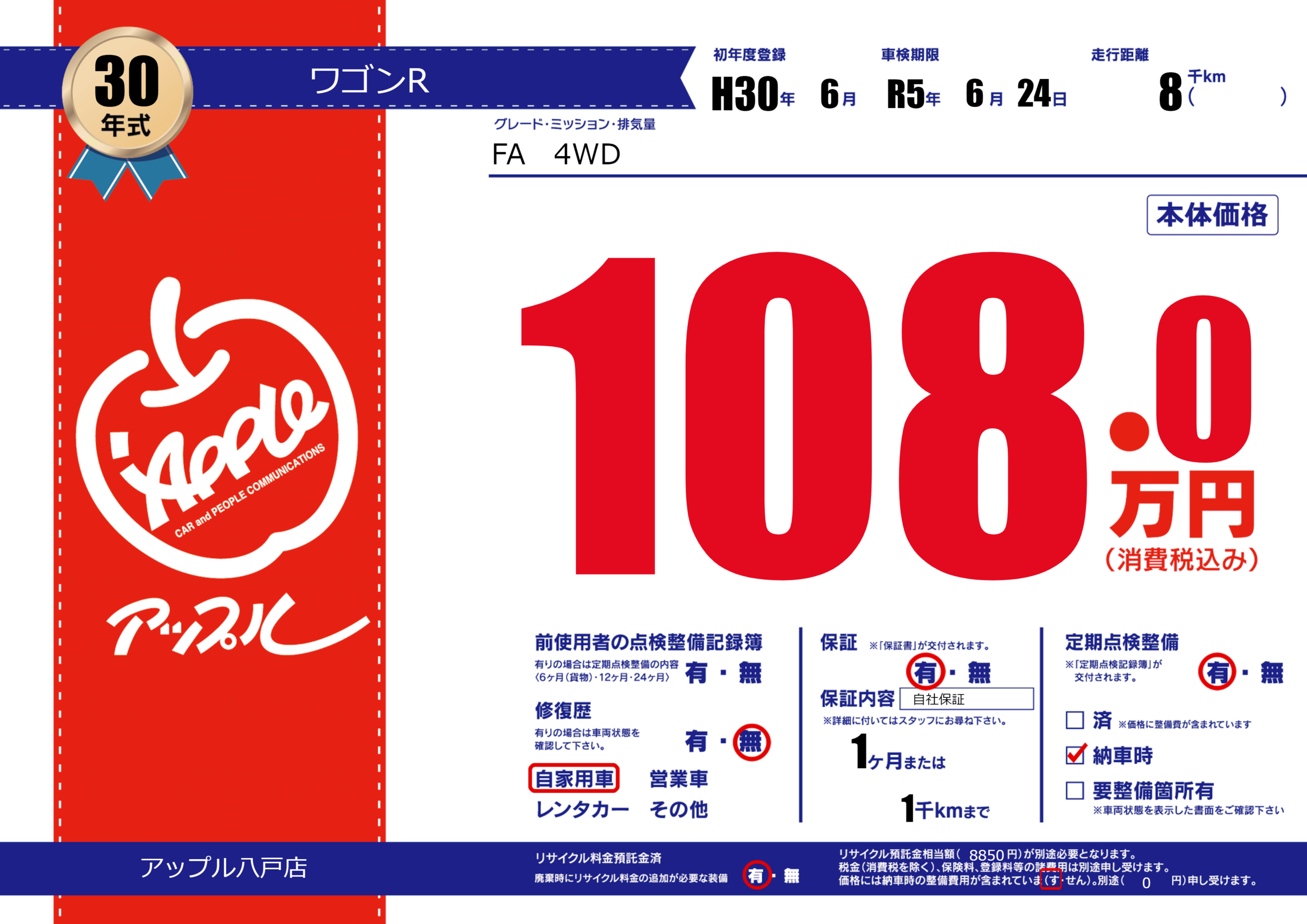 | 走行キロ | 0.8万km | 初年度登録 | H30年6月 |