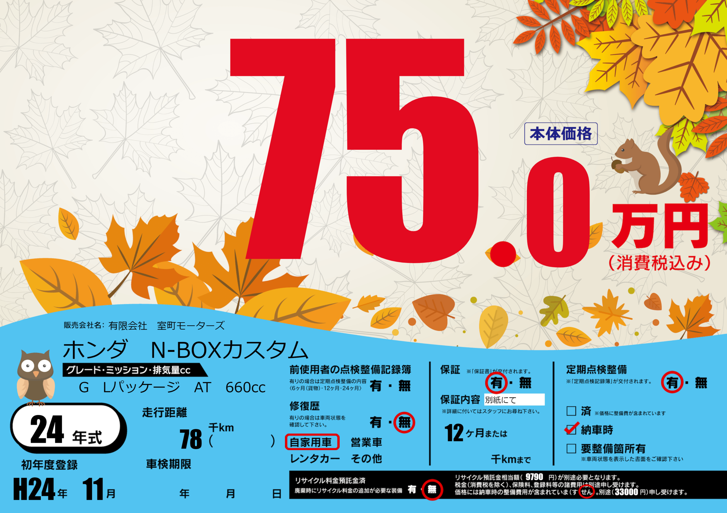 | 車名 | ホンダ N-BOXカスタム | グレード ミッション 排気量 |