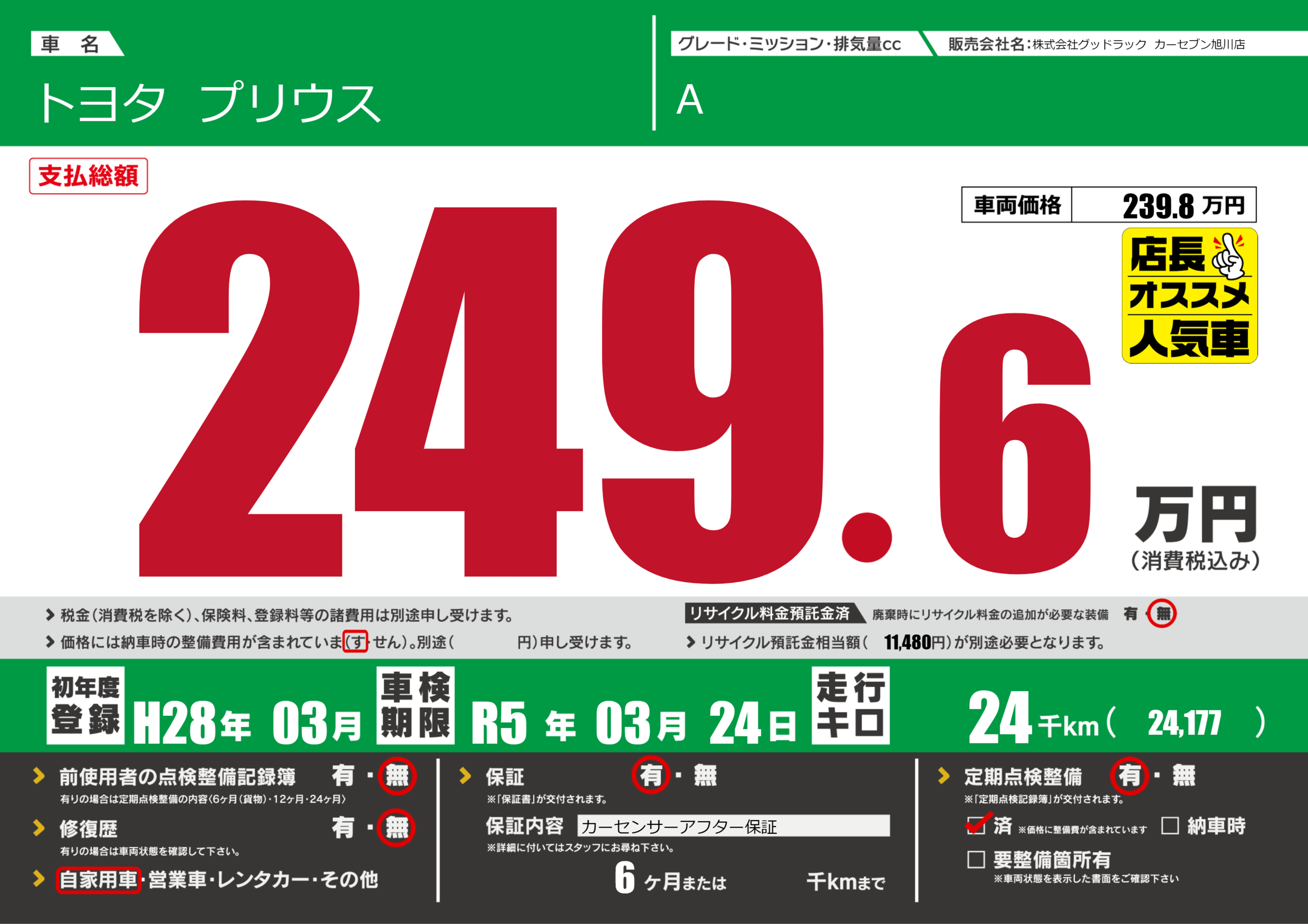 | 車名 | トヨタ プリウス | グレード ミッション 排気量 |