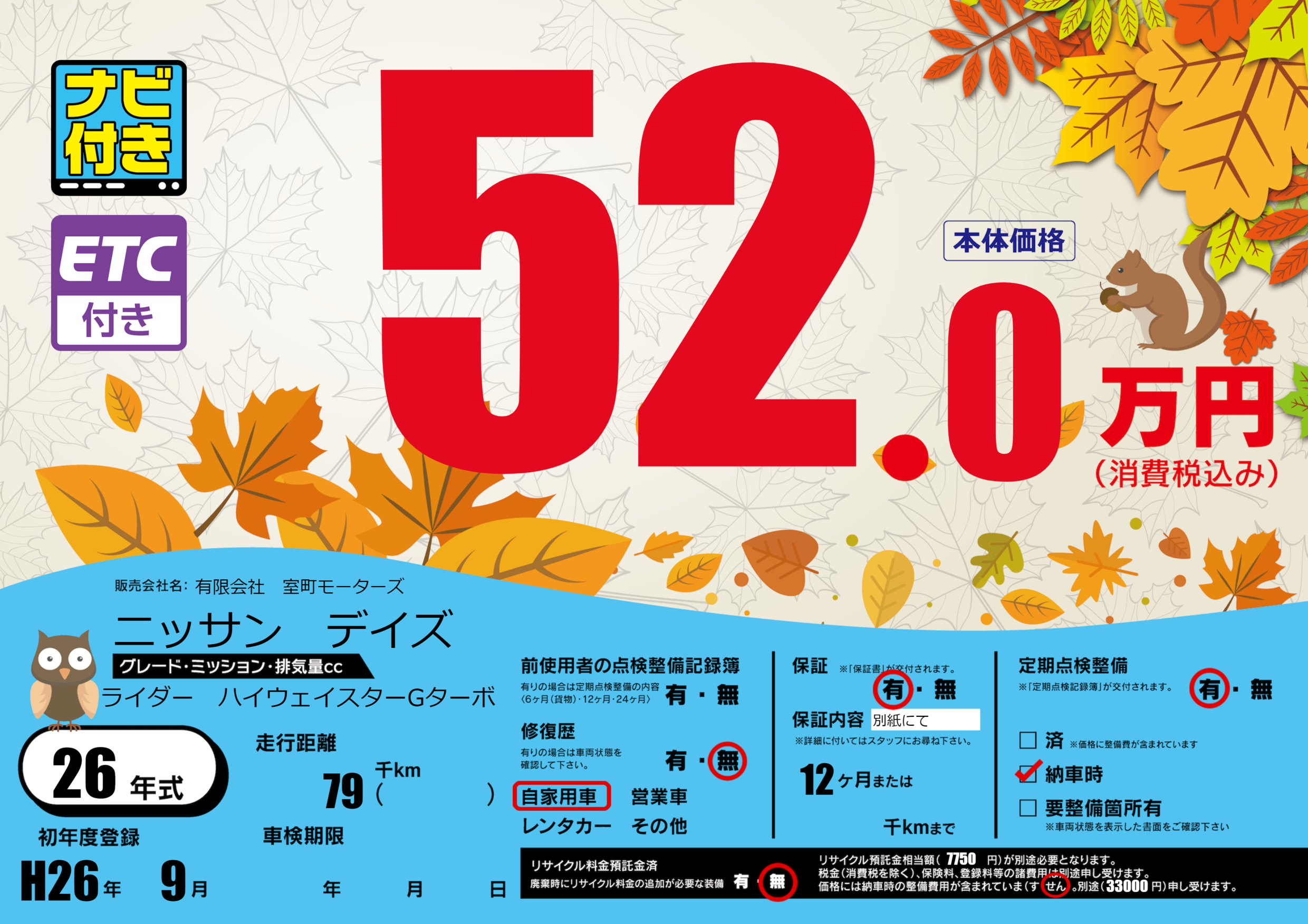 保証付き 保証内容(別紙にて) 12ヶ月または()千kmまで |