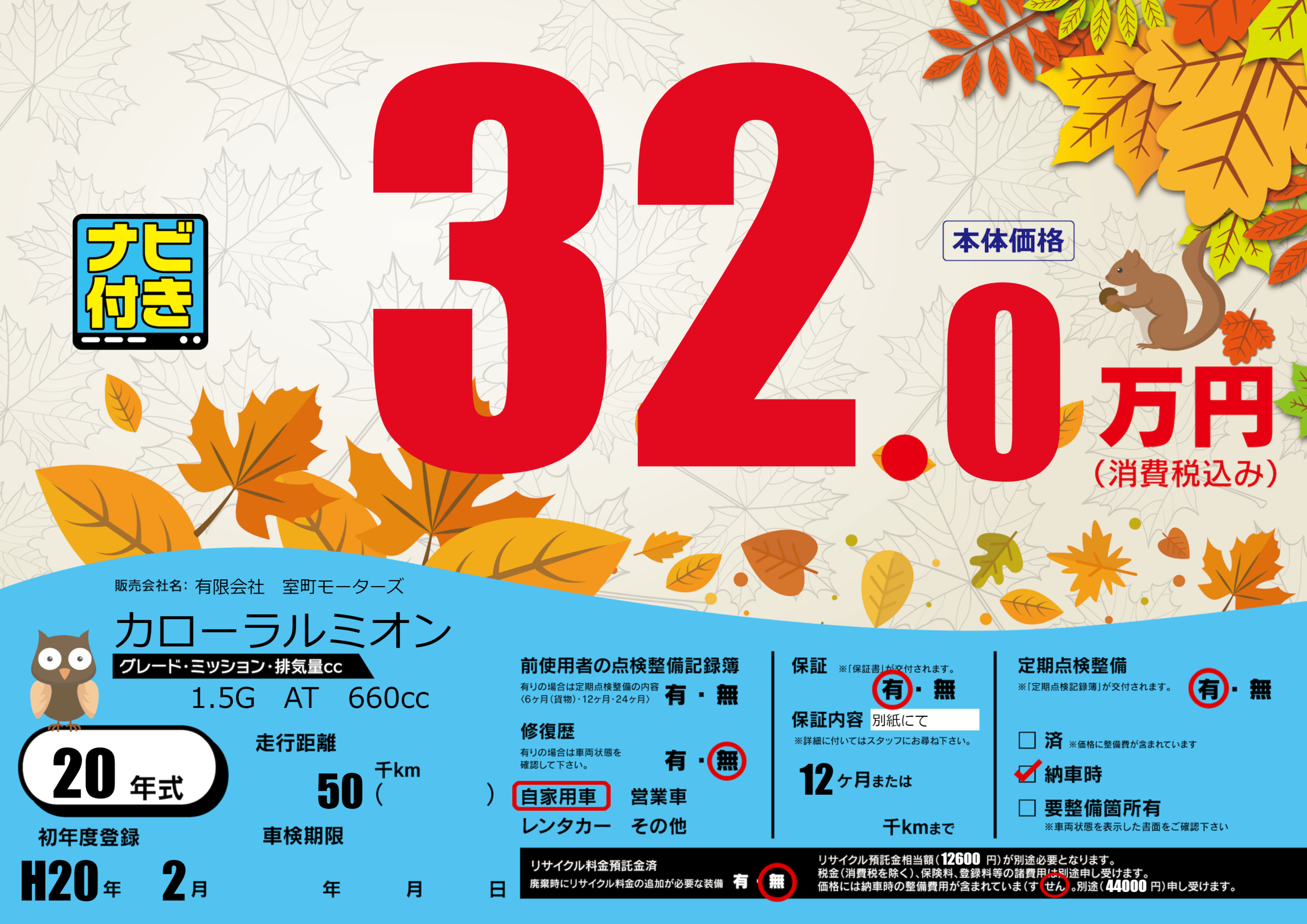 保証付き 保証内容(別紙にて) 12ヶ月または()千kmまで |