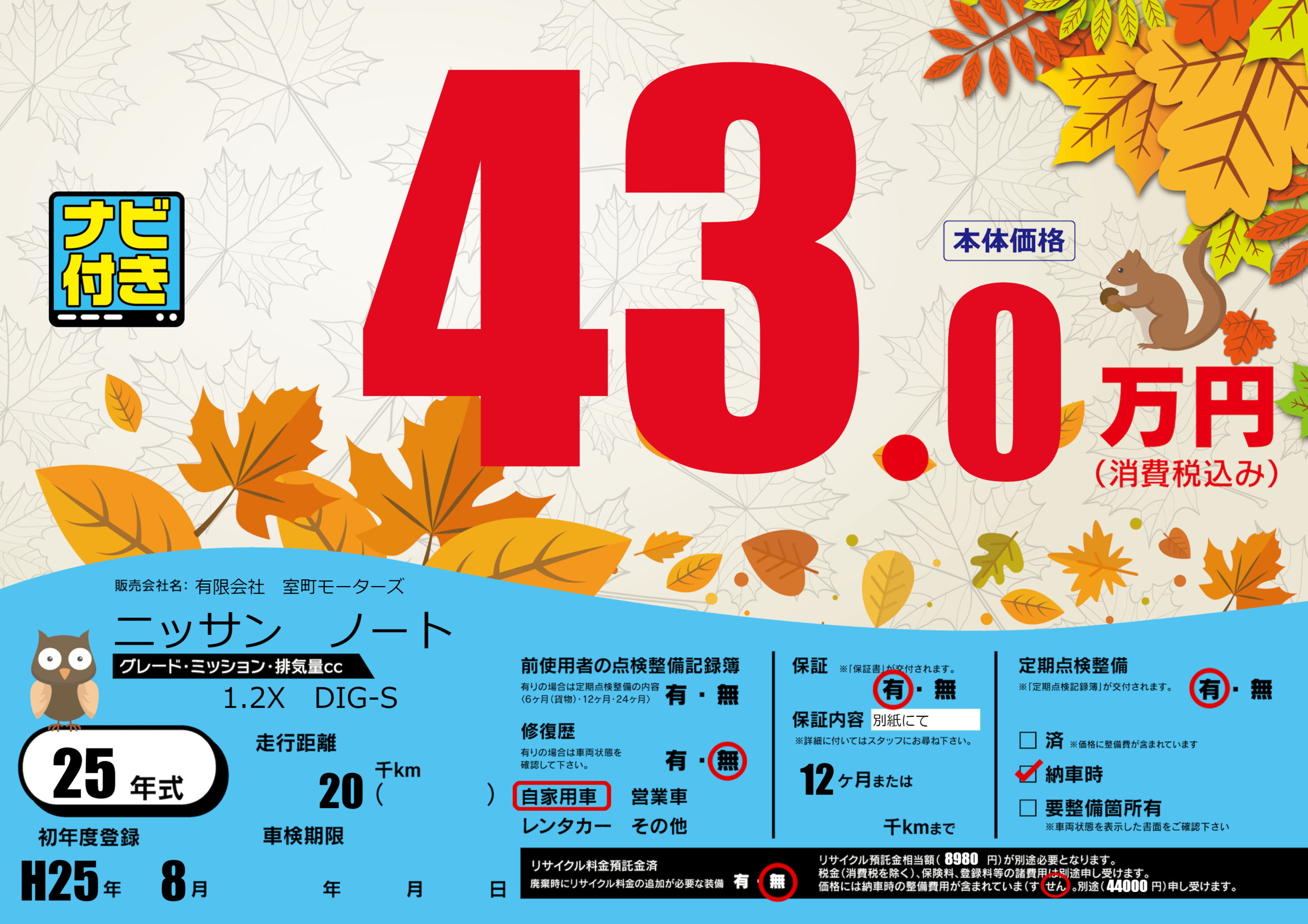 保証付き 保証内容(別紙にて) 12ヶ月または()千kmまで |