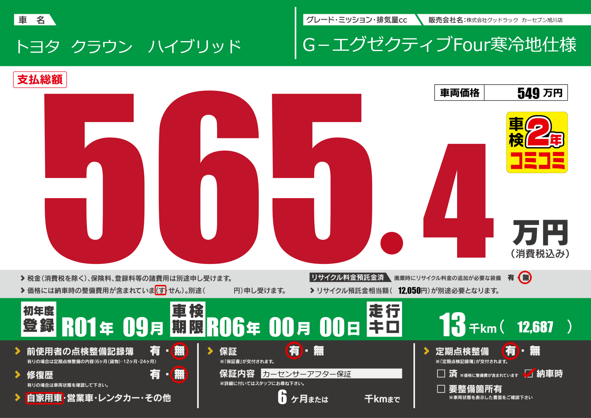 | 走行キロ | 1.3万km | 初年度登録 | R01年09月 |