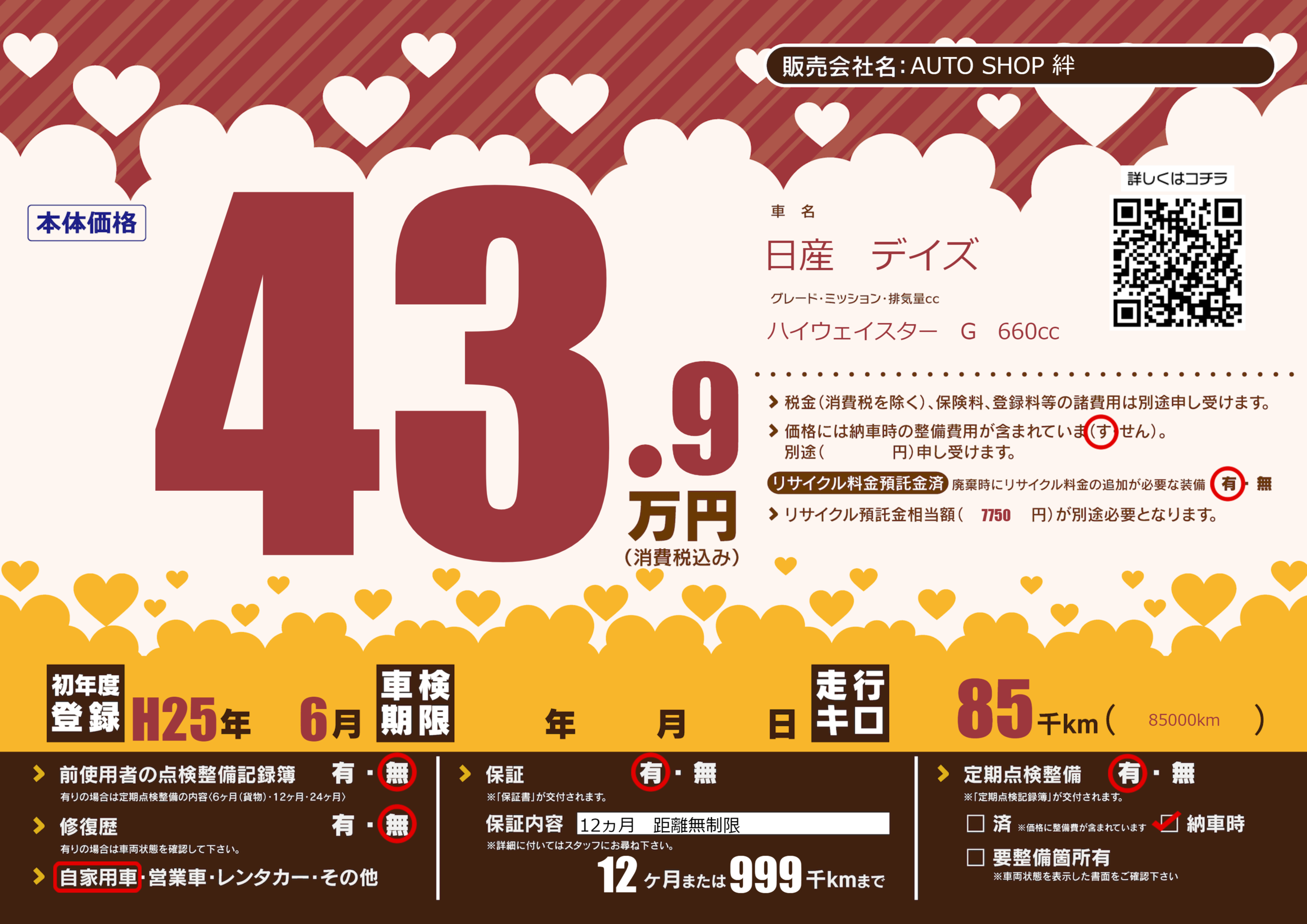 | 車名 | 日産 デイズ | グレード ミッション 排気量 |