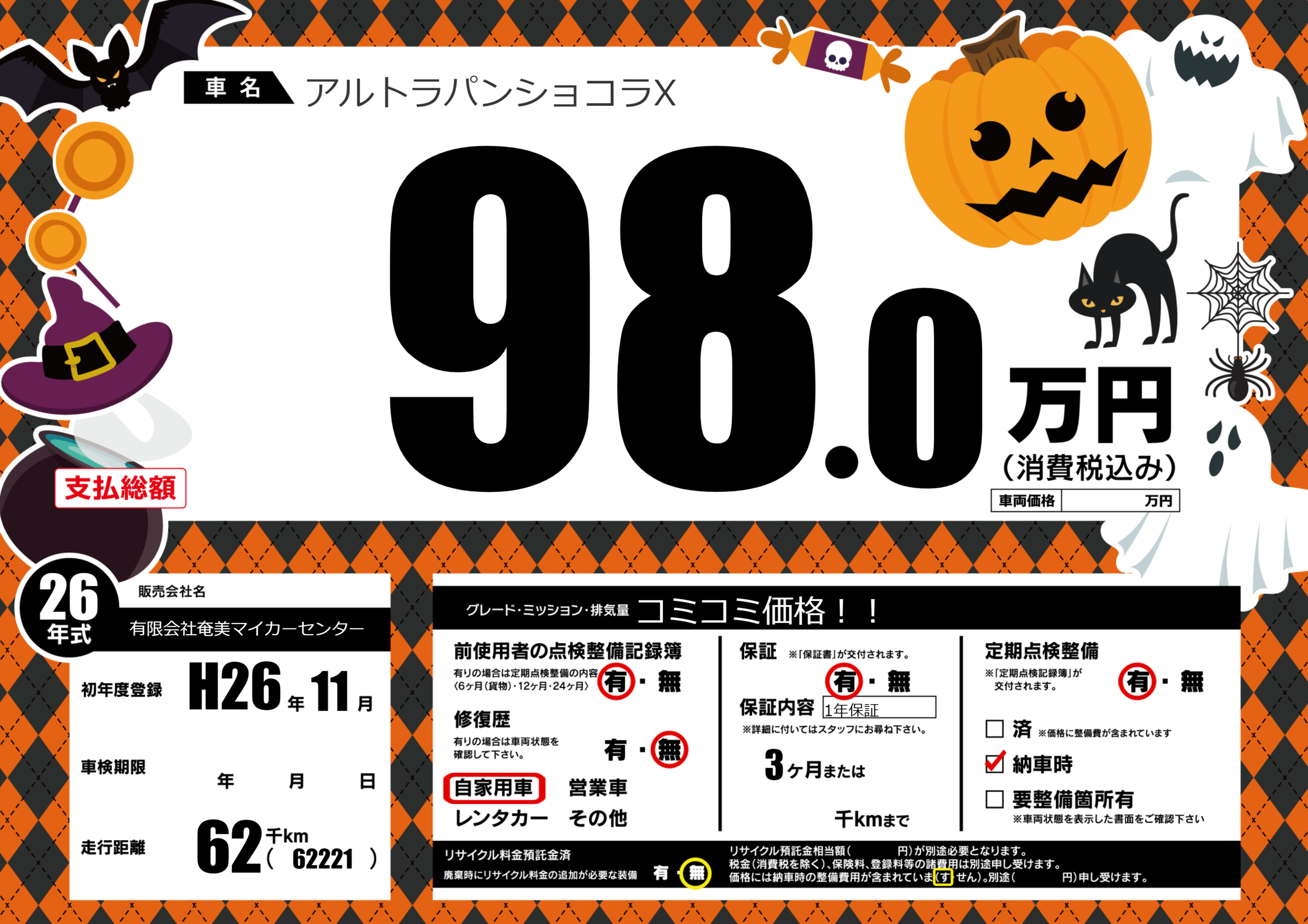 | 走行キロ | 6.2万km | 初年度登録 | H26年11月 |
