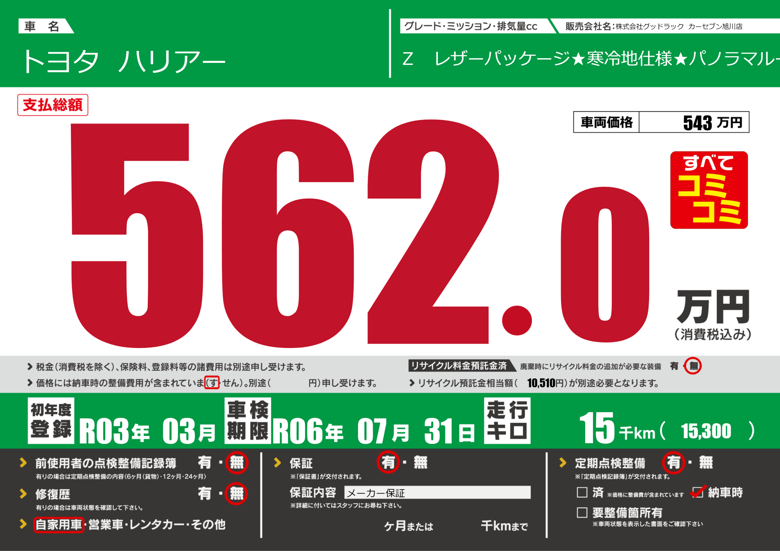 | 走行キロ | 1.5万km | 初年度登録 | R03年03月 |