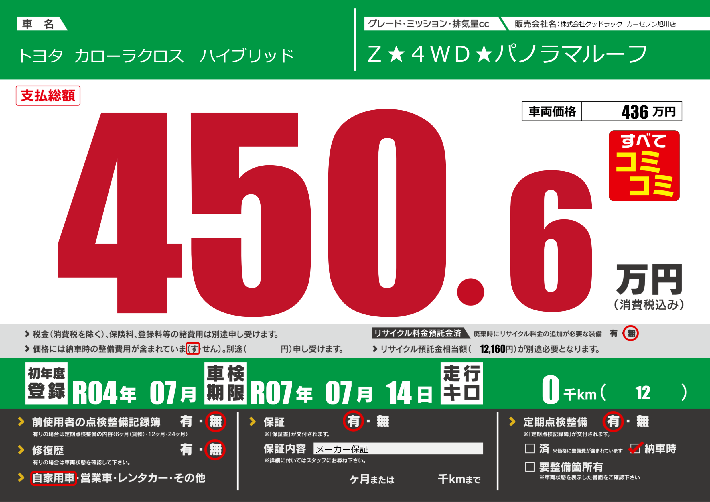 | 車名 | トヨタ カローラクロス ハイブリッド | グレード ミッション 排気量 |