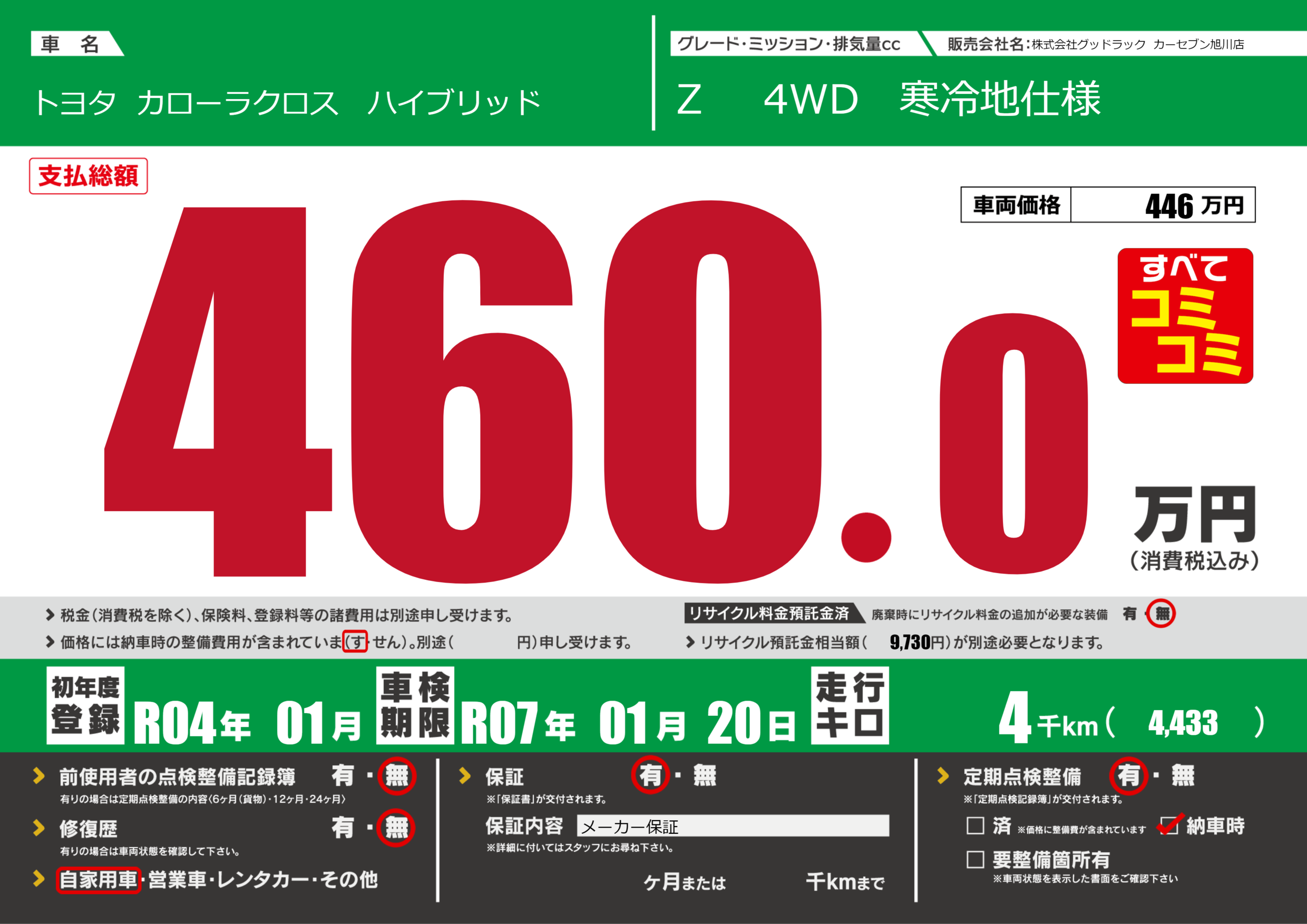 | 車名 | トヨタ カローラクロス ハイブリッド | グレード ミッション 排気量 |