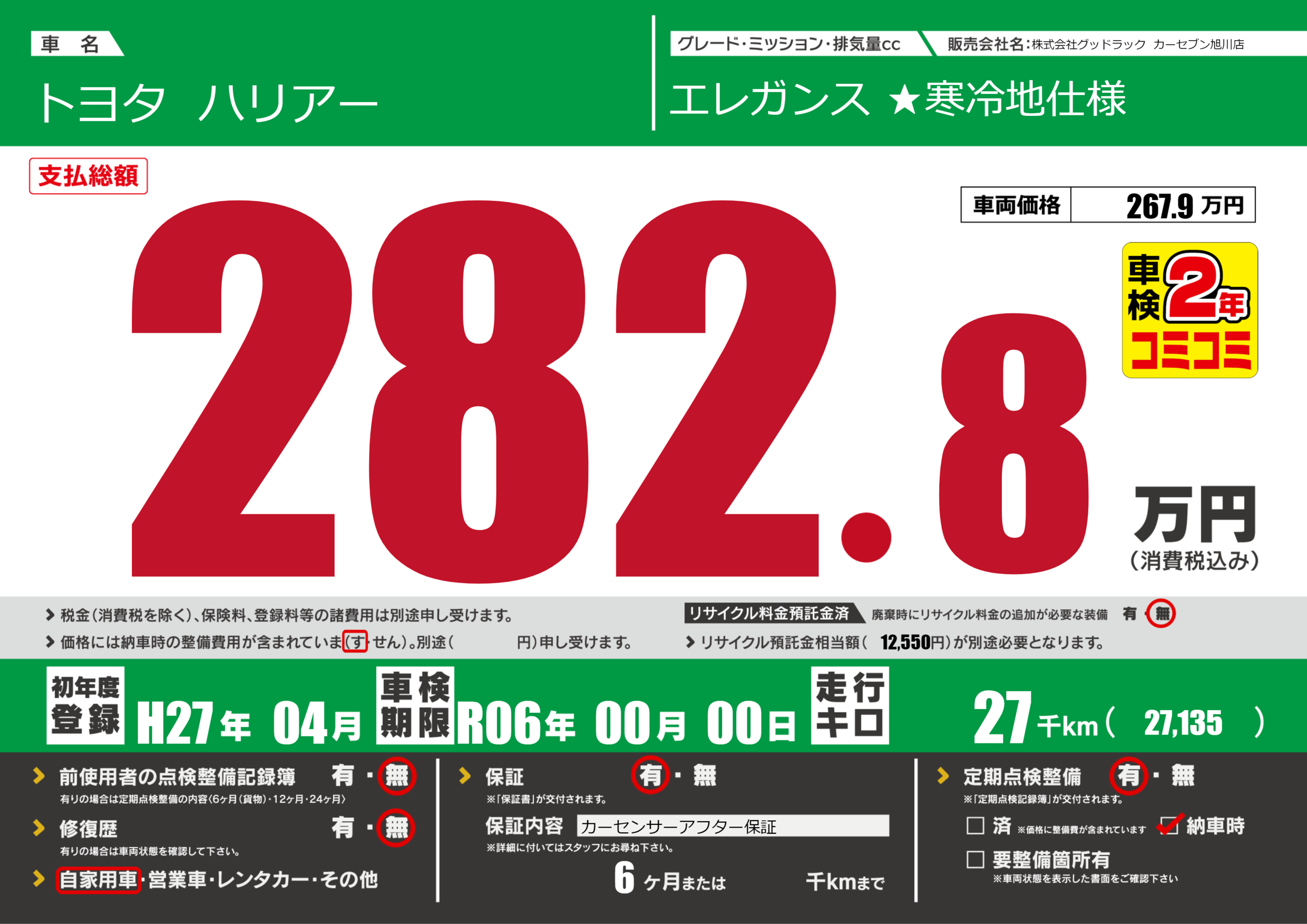 | 走行キロ | 2.7万km | 初年度登録 | H27年04月 |