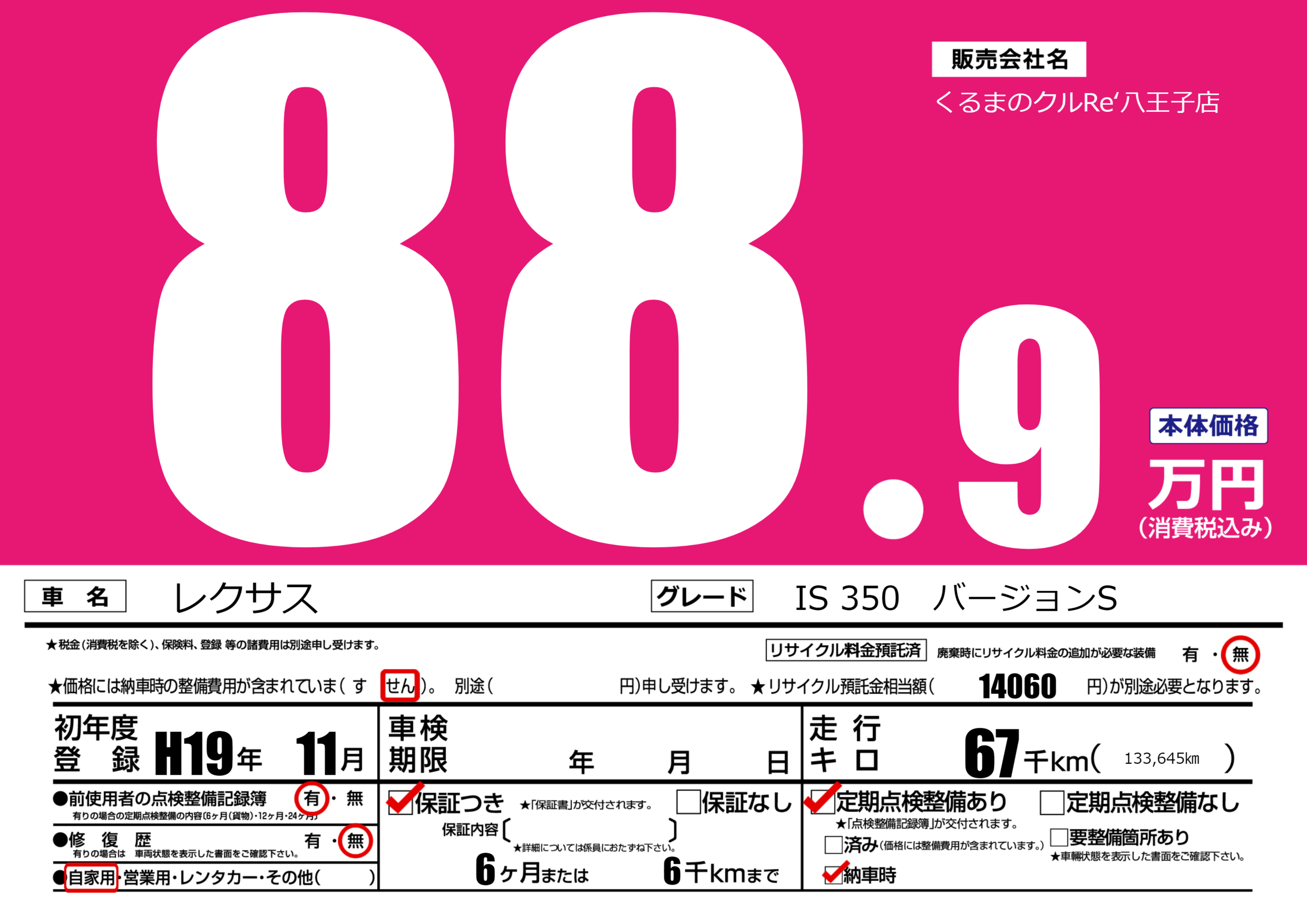 | 車名 | レクサス | グレード ミッション 排気量 |