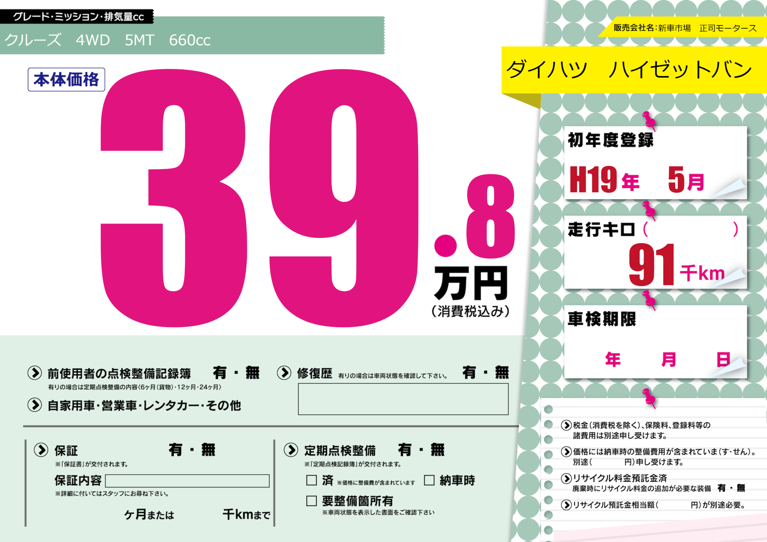 保証なし 保証内容(---) ヶ月または( )千kmまで |