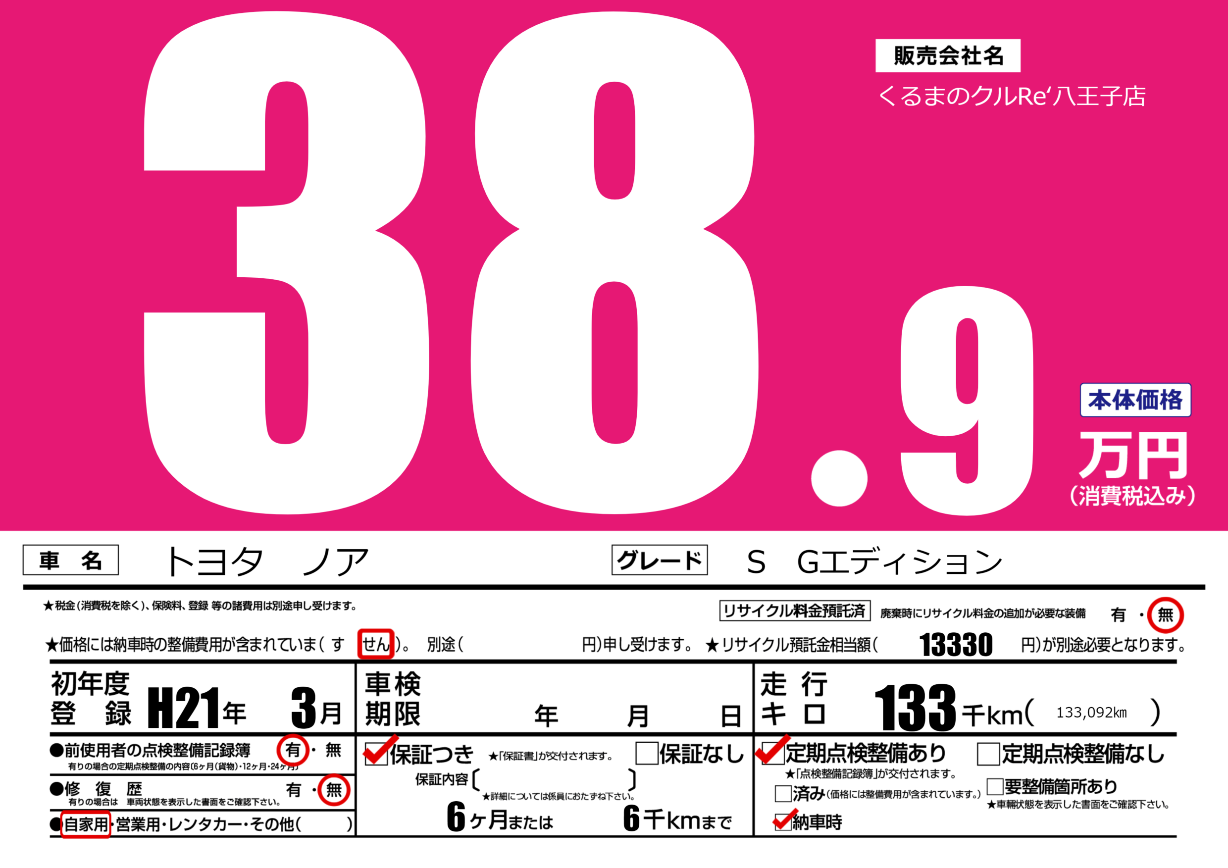 | 車名 | トヨタ ノア | グレード ミッション 排気量 |