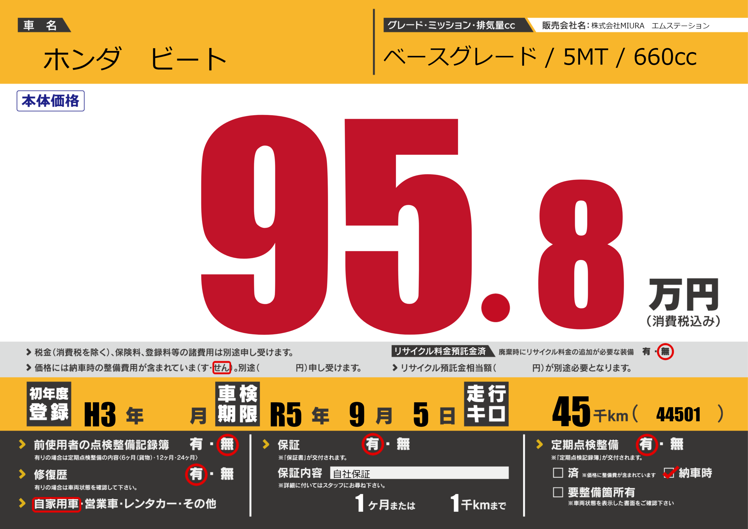 | 車名 | ホンダ ビート | グレード ミッション 排気量 |