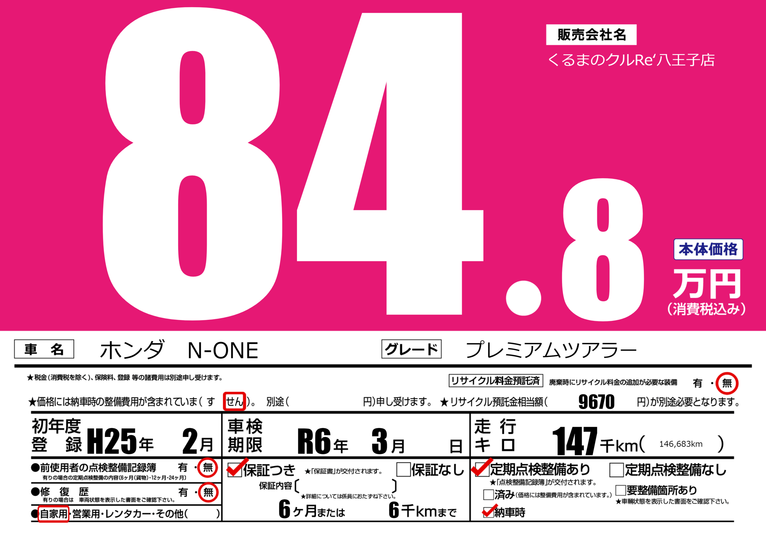| 車名 | ホンダ N-ONE | グレード ミッション 排気量 |