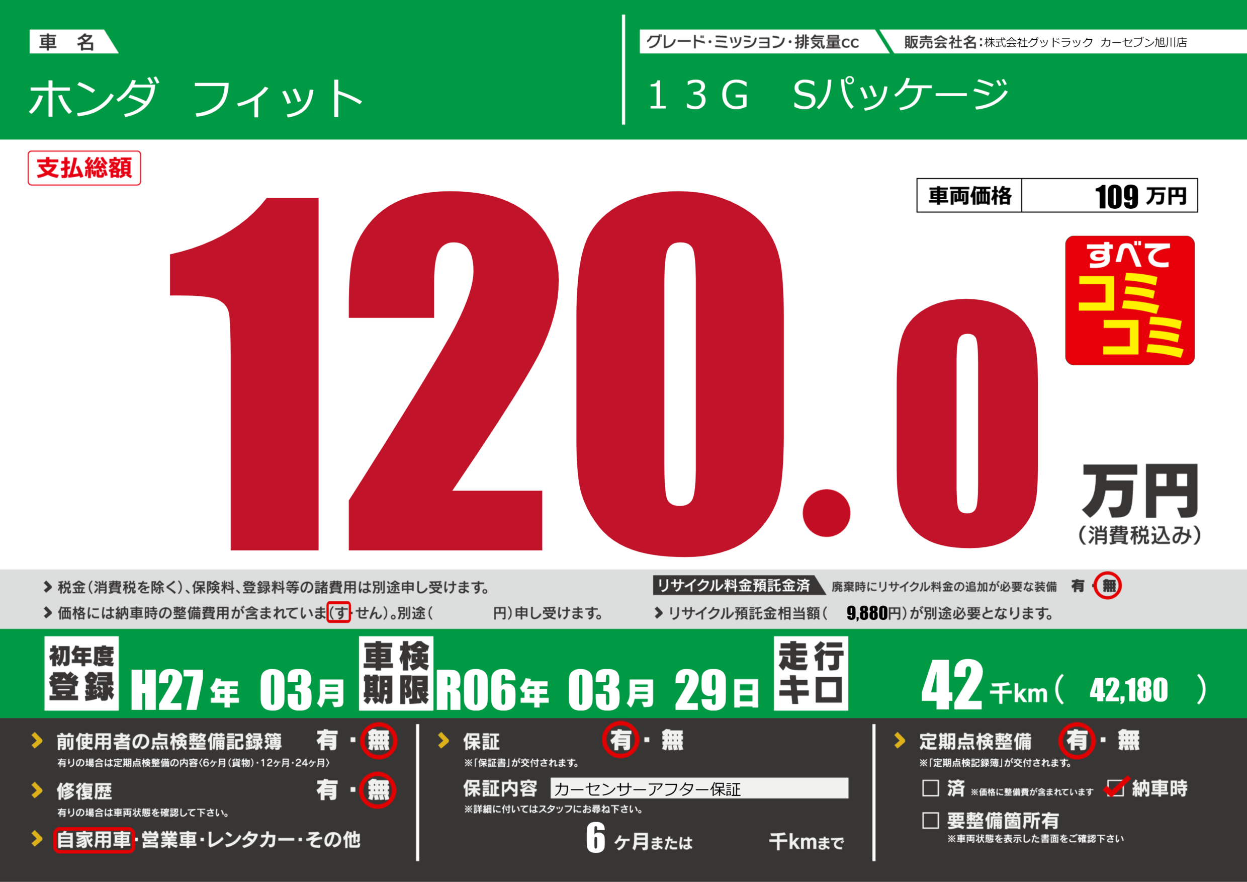 | 走行キロ | 4.2万km | 初年度登録 | H27年03月 |