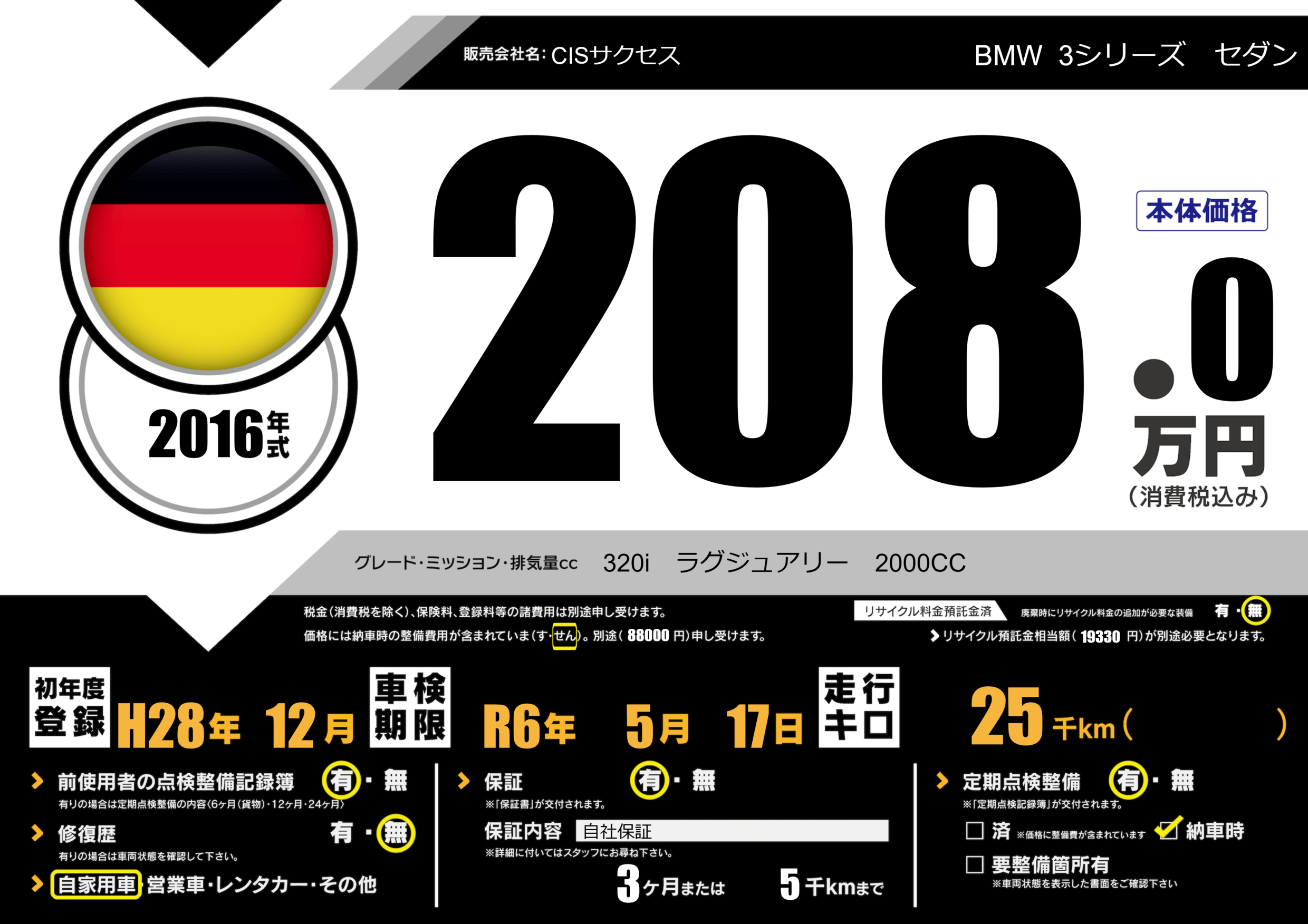 | 車名 | BMW 3シリーズ セダン | グレード ミッション 排気量 |