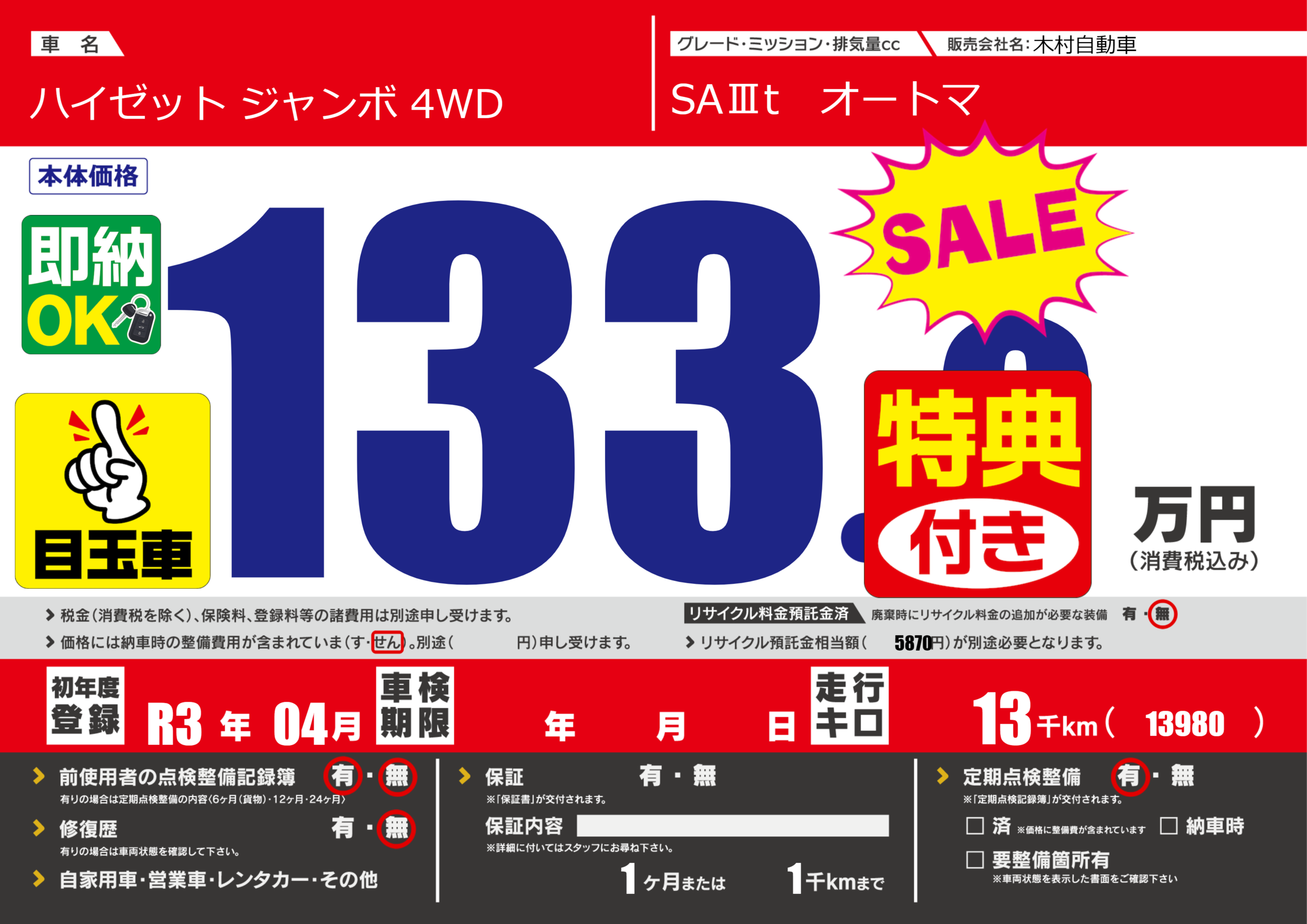 保証なし 保証内容(---) 1ヶ月または(1)千kmまで |