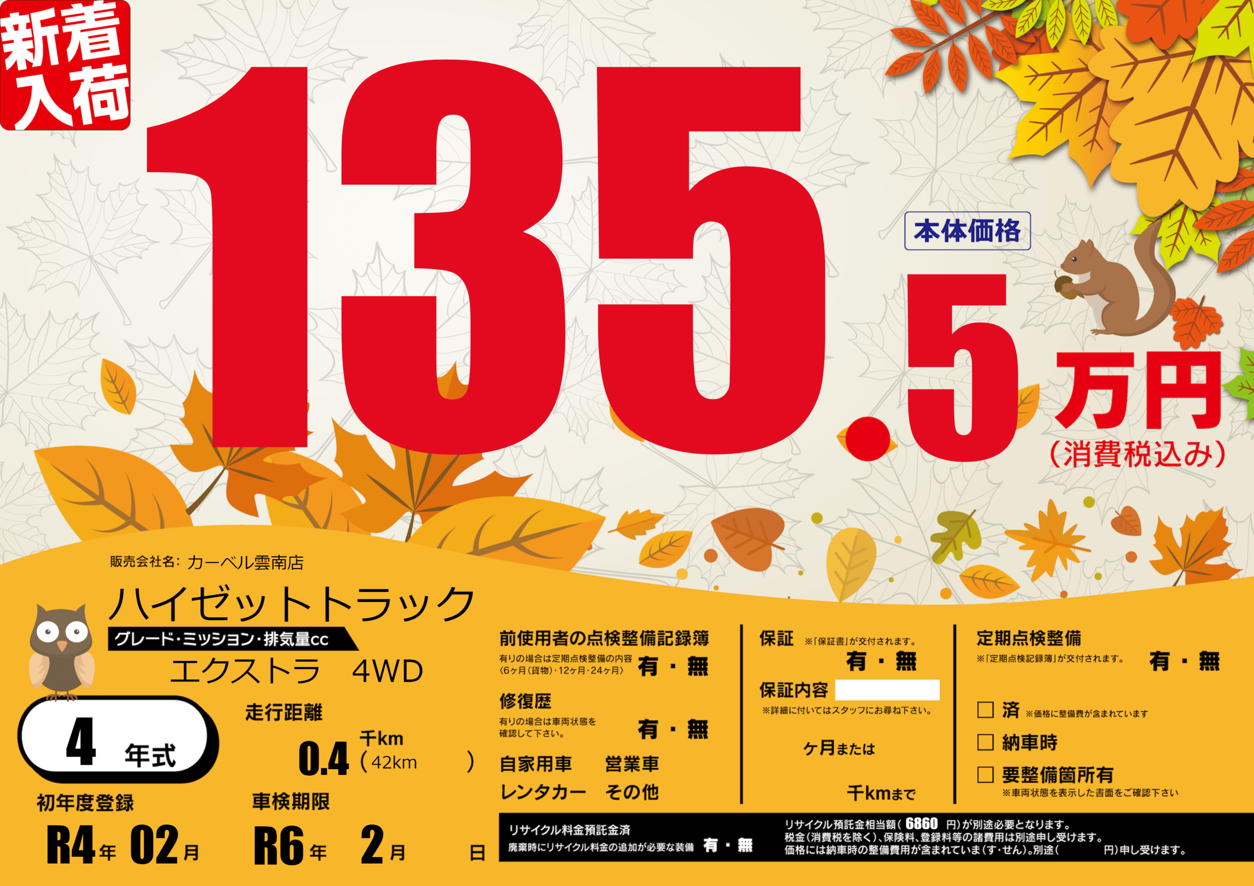 | 走行キロ | - | 初年度登録 | R4年02月 |
