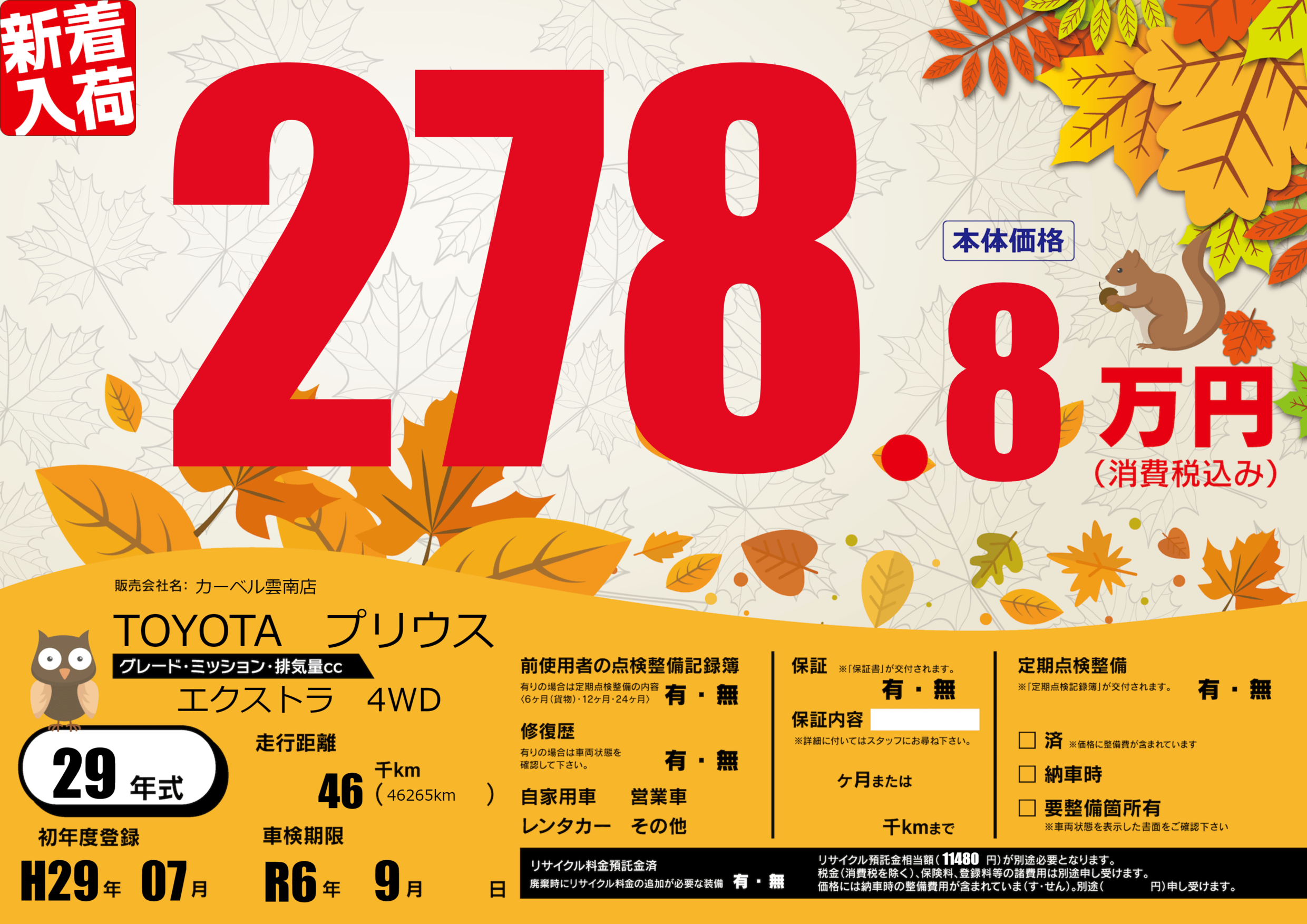 | 車名 | TOYOTA プリウス | グレード ミッション 排気量 |