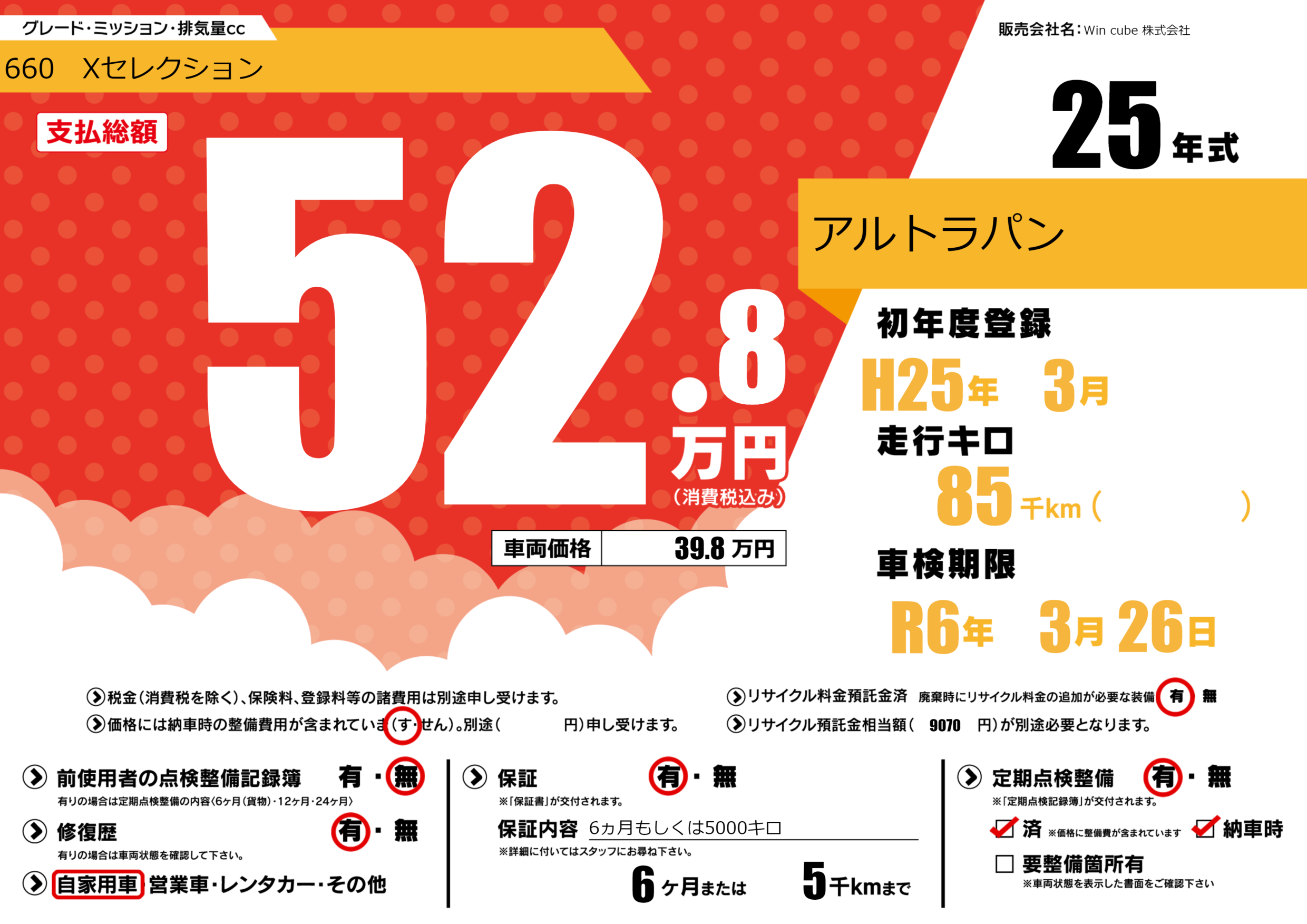 | 定期点検整備 | 定期点検整備あり 定期点検整備済み 納車時あり | ||