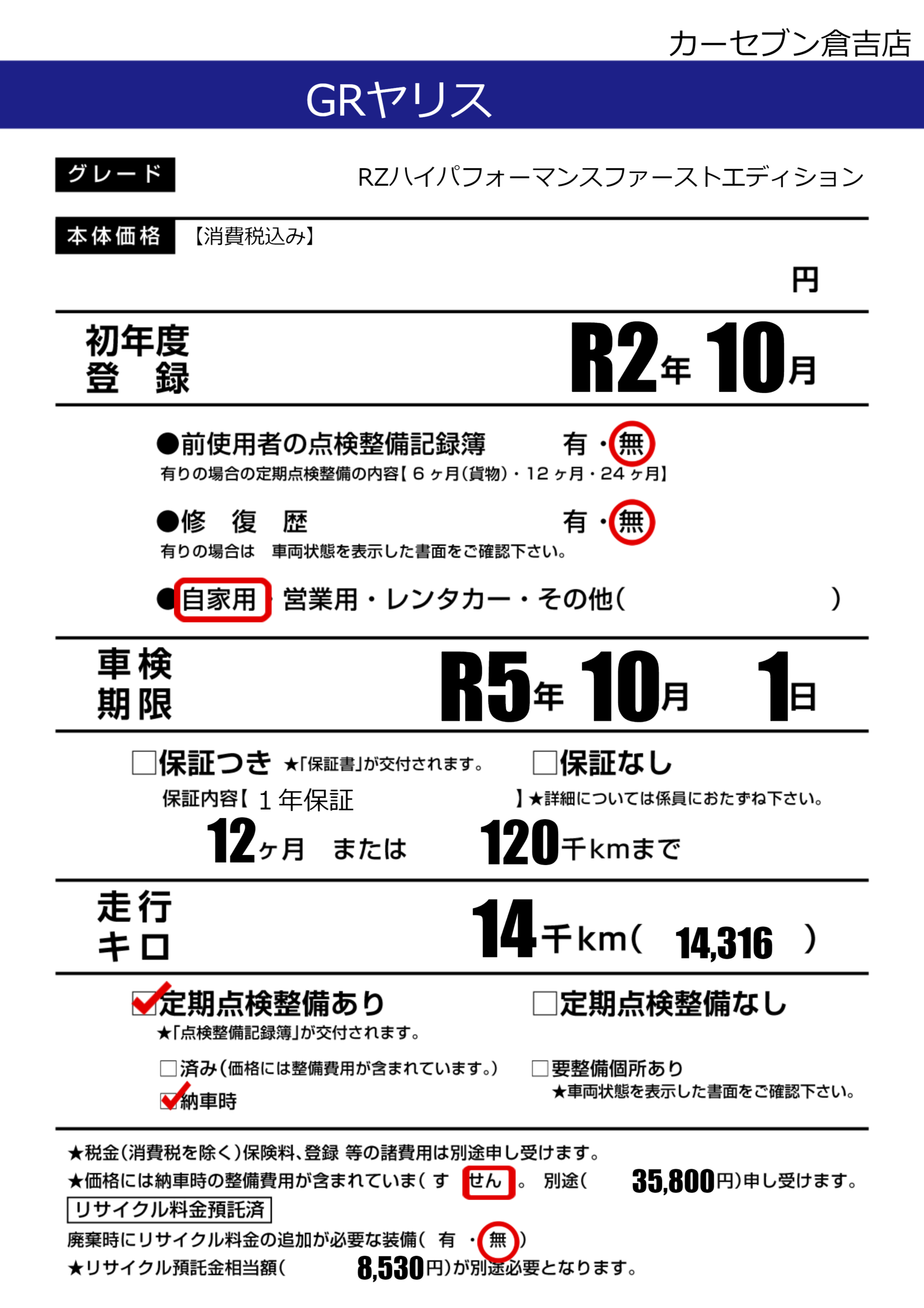 | 車名 | GRヤリス | グレード ミッション 排気量 |