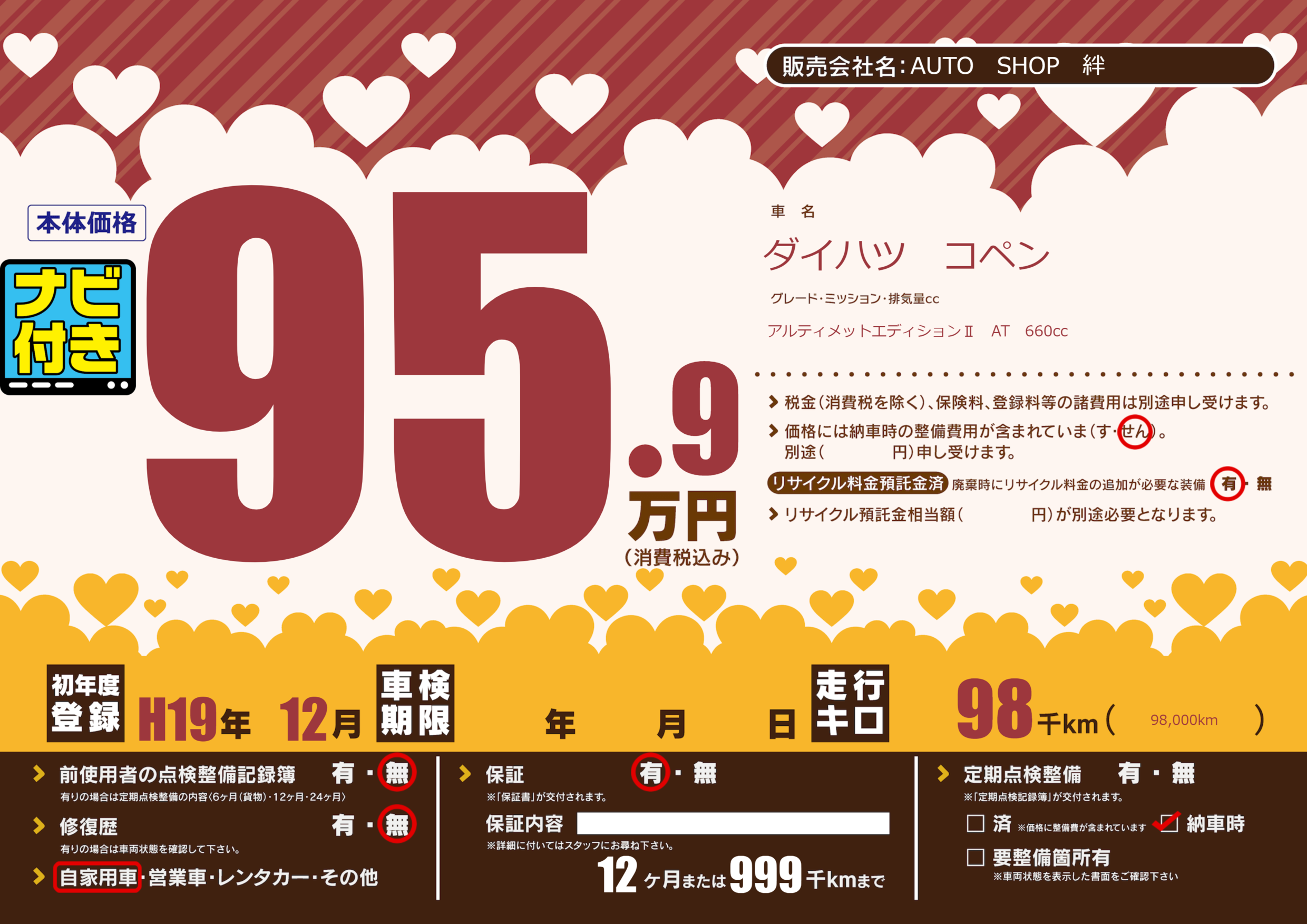 | 車名 | ダイハツ コペン | グレード ミッション 排気量 |