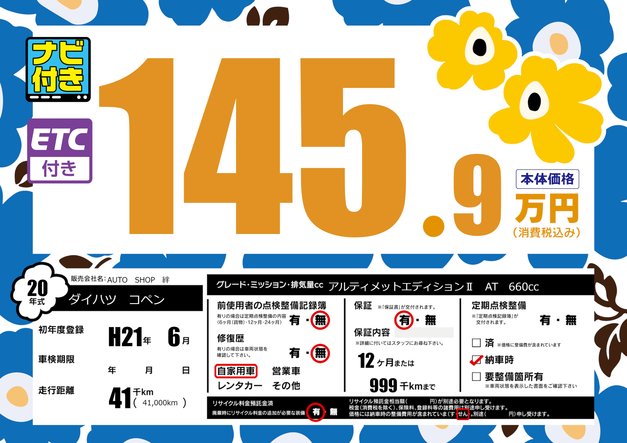 | 車名 | ダイハツ コペン | グレード ミッション 排気量 |