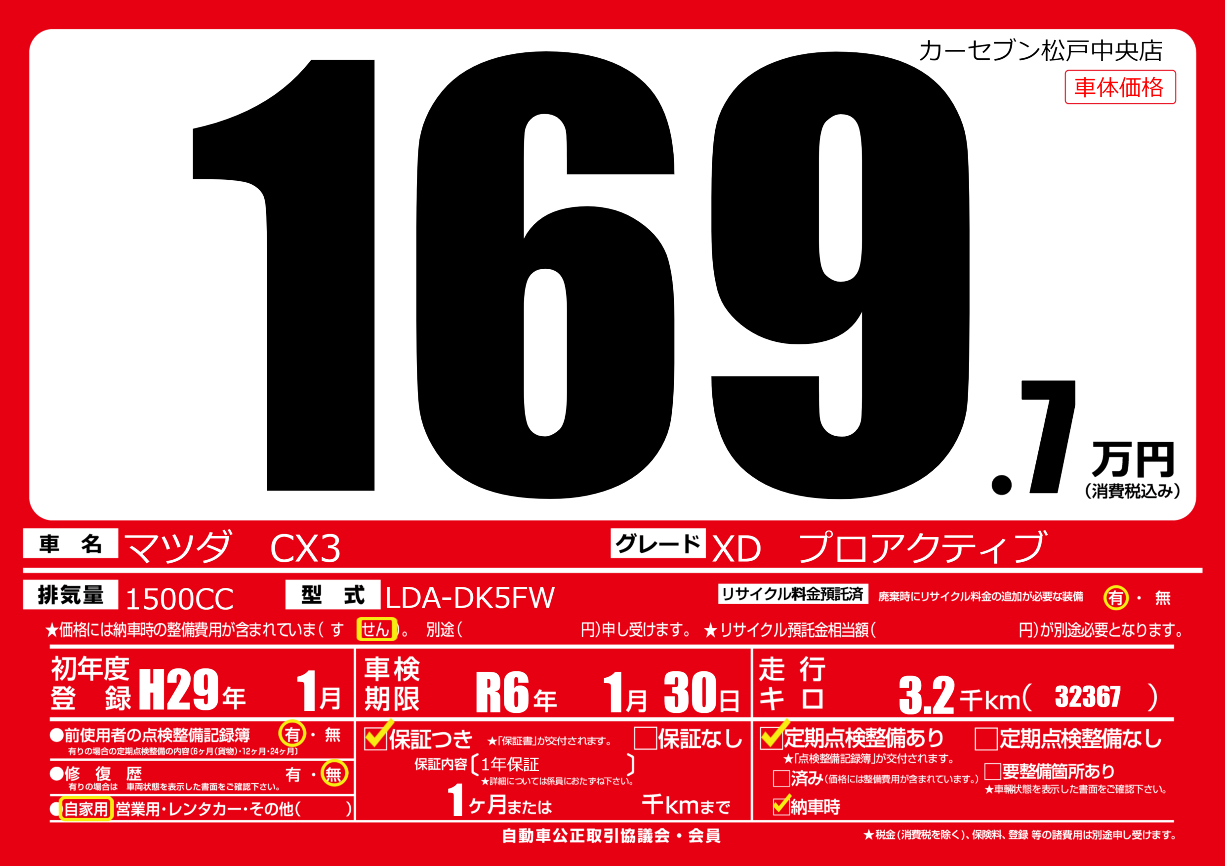 | 車名 | マツダ CX3 | グレード ミッション 排気量 |