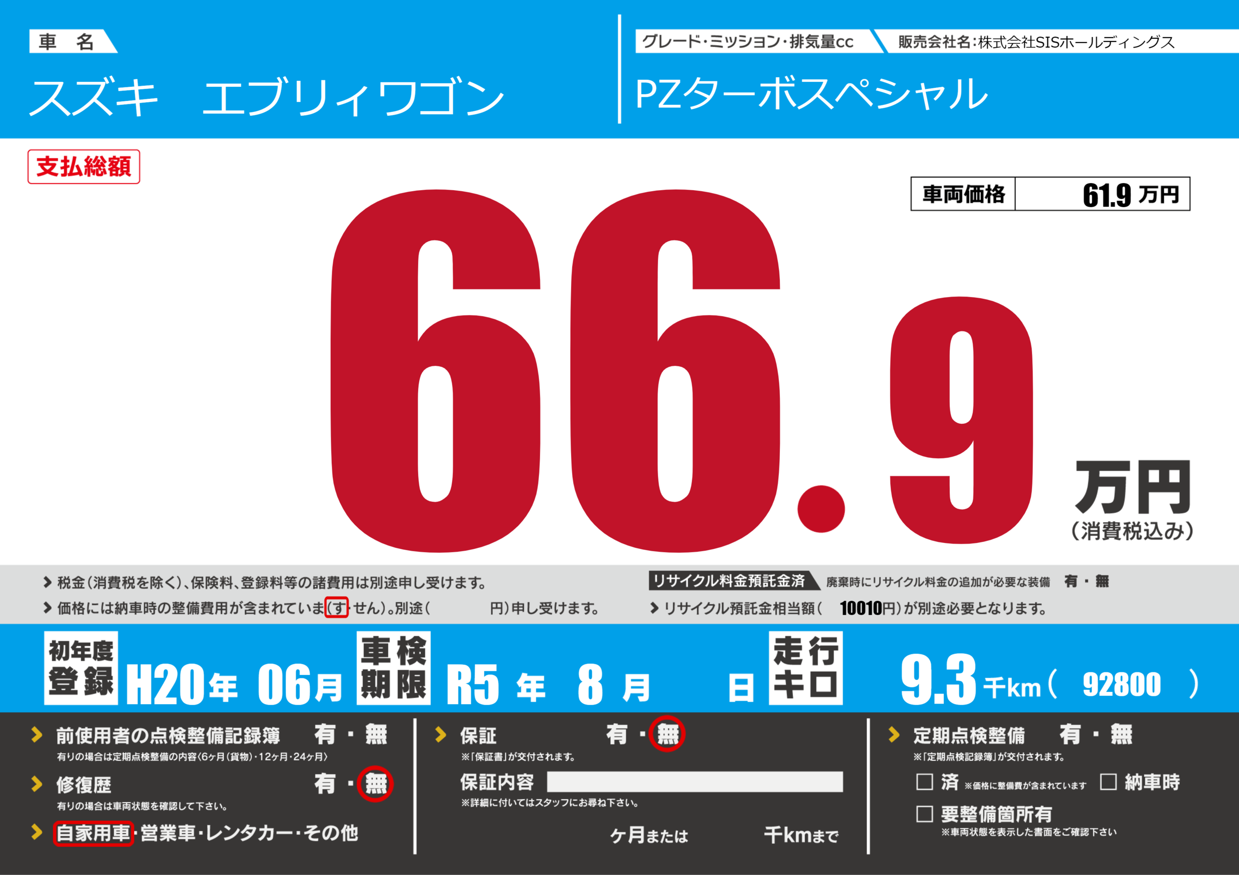 | 車検制限 | R5年 8月 - 日 | ||