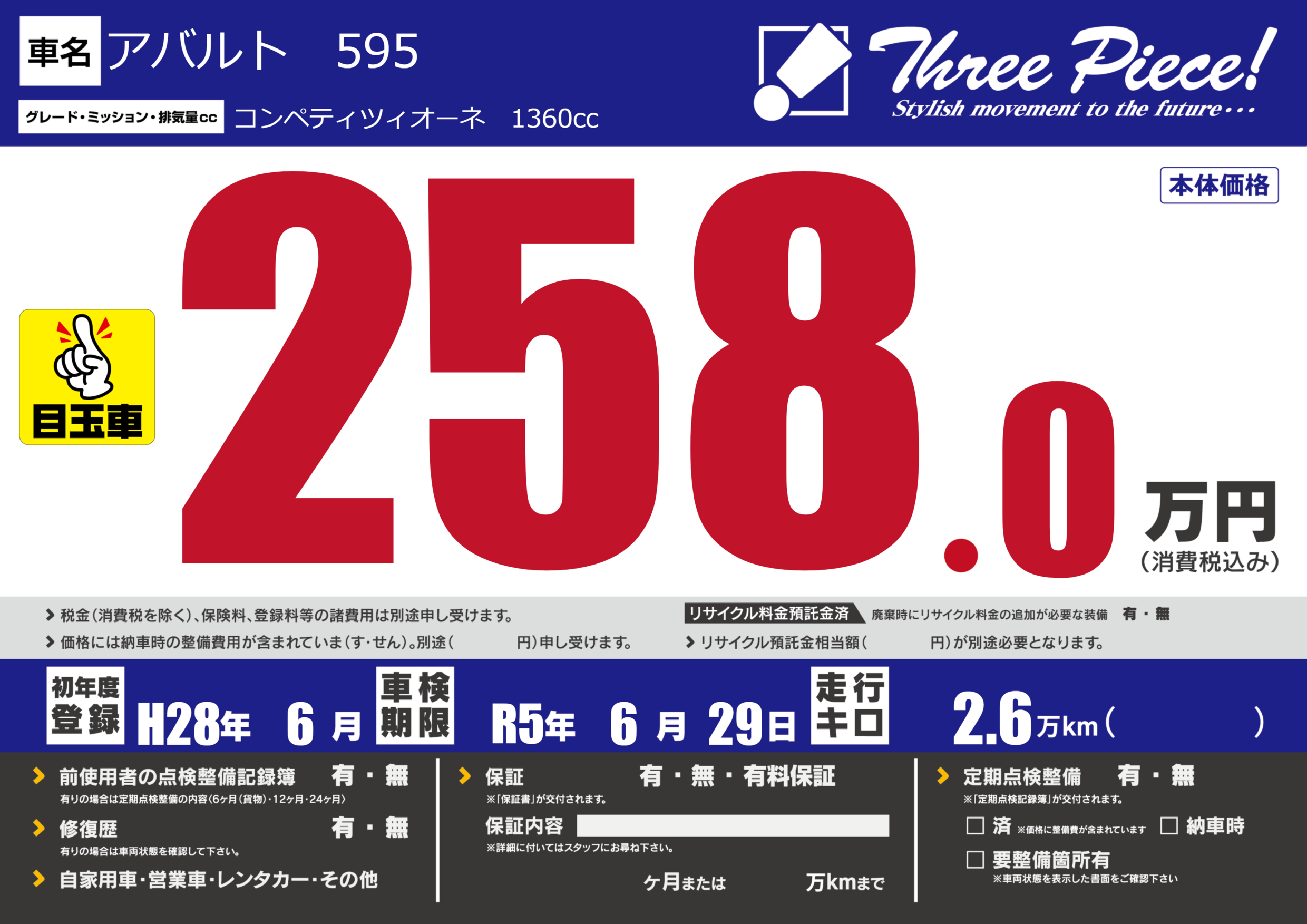 | 車名 | アバルト 595 | グレード ミッション 排気量 |