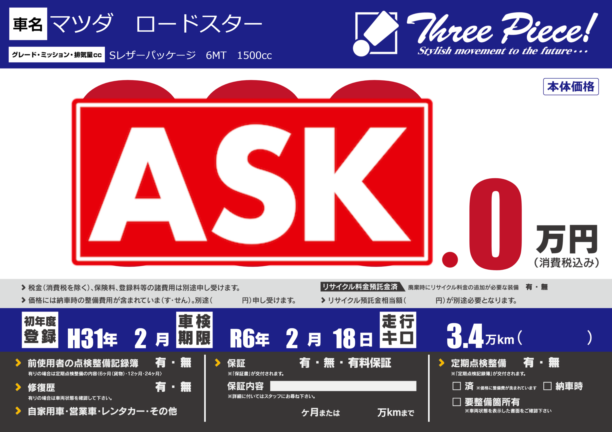 | 走行キロ | 0.3万km | 初年度登録 | H31年2月 |