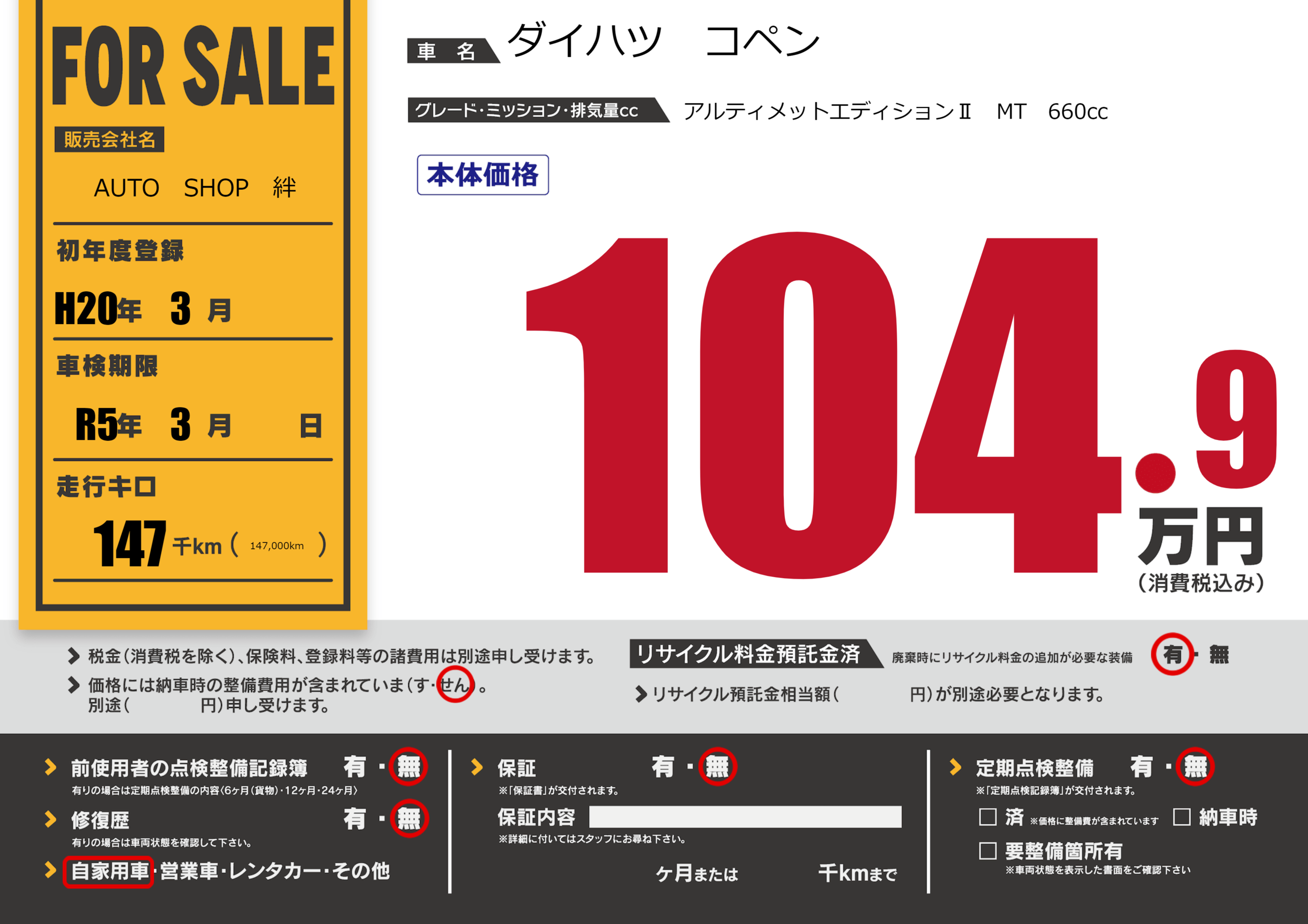なし | 車検制限 | R5年3月---月 |