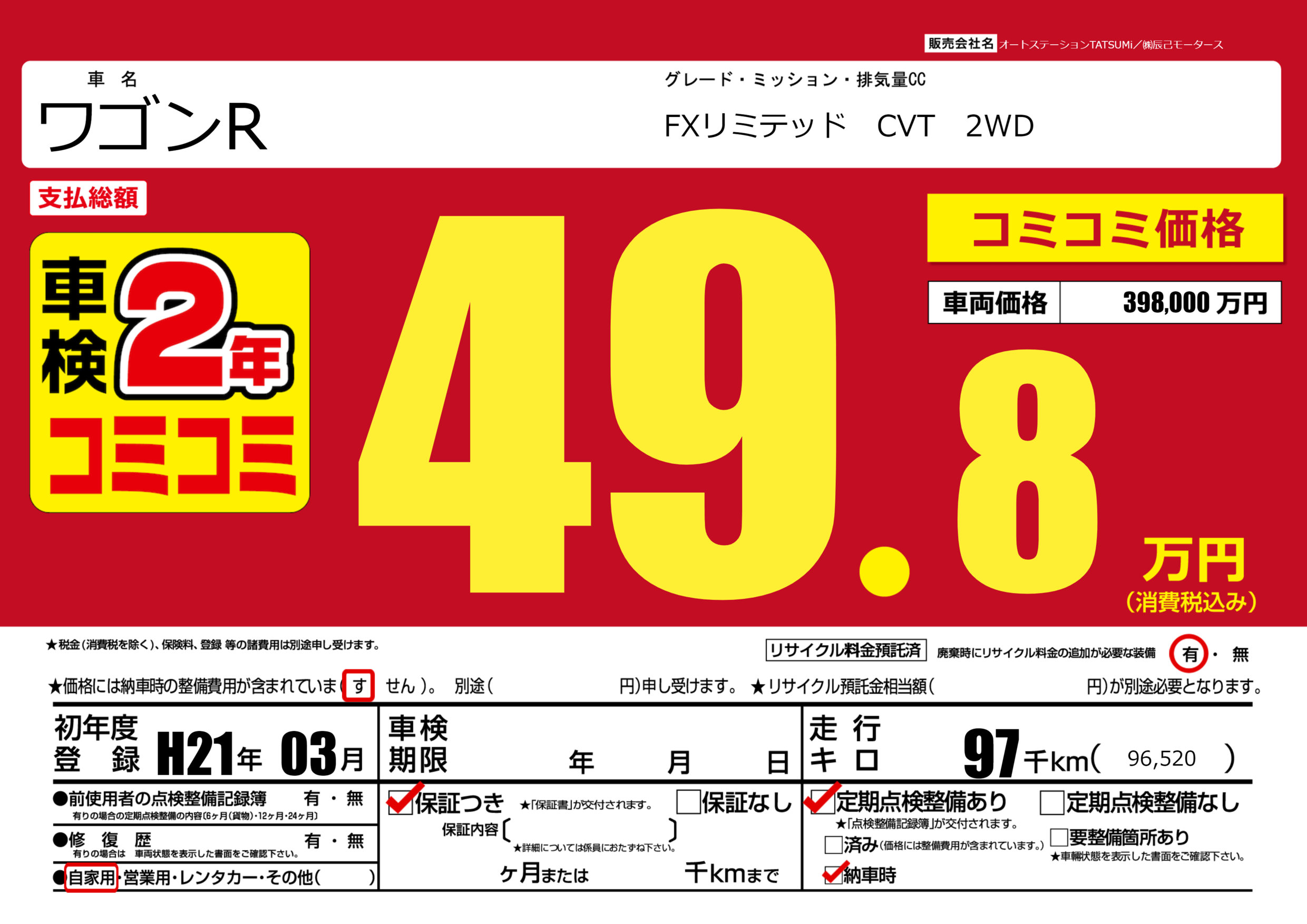 | 車名 | ワゴンR | グレード ミッション 排気量 |