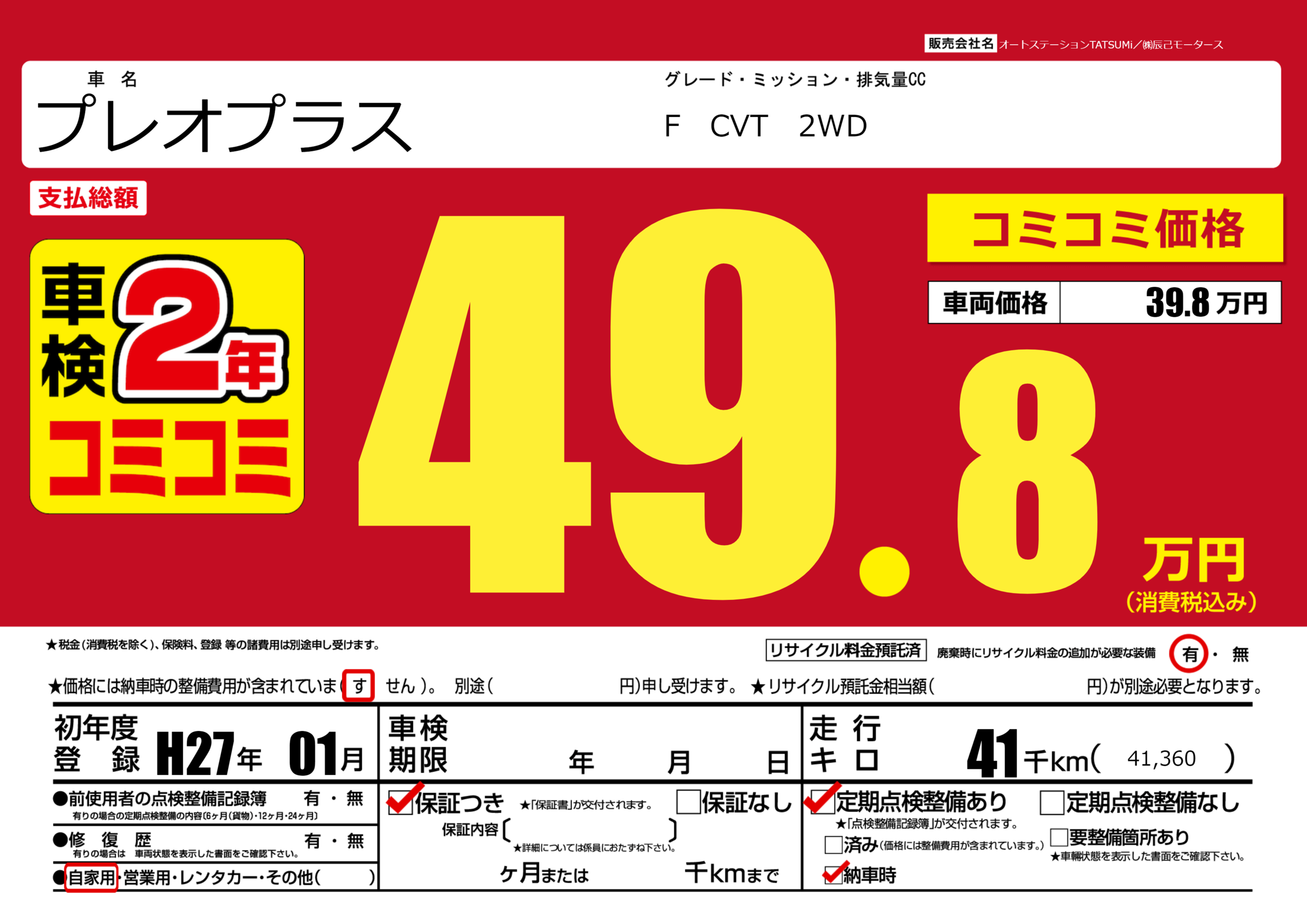 | 車名 | プレオプラス | グレード ミッション 排気量 |