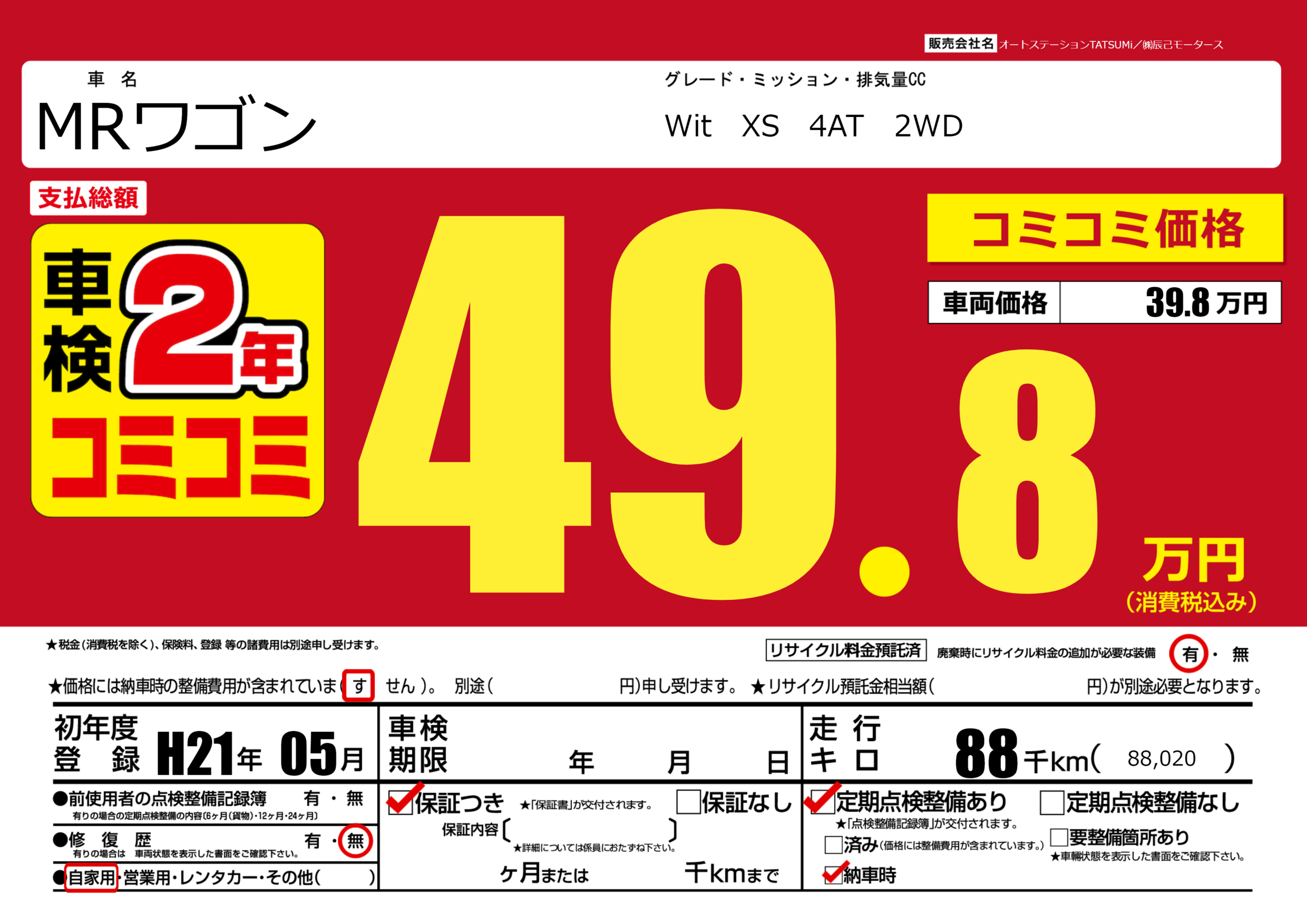 | 車名 | MRワゴン | グレード ミッション 排気量 |