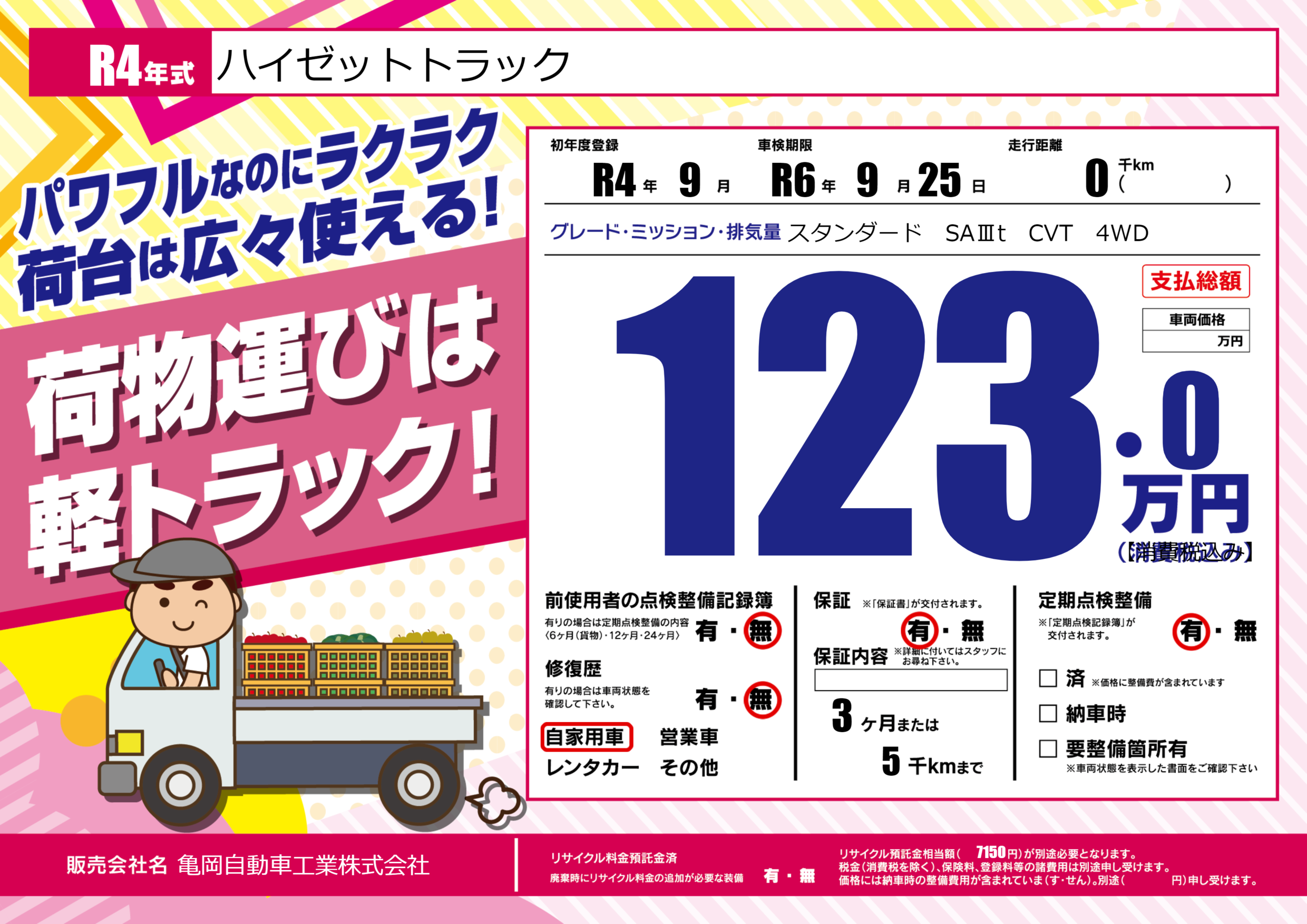 | 車名 | ハイゼットトラック | グレード ミッション 排気量 |