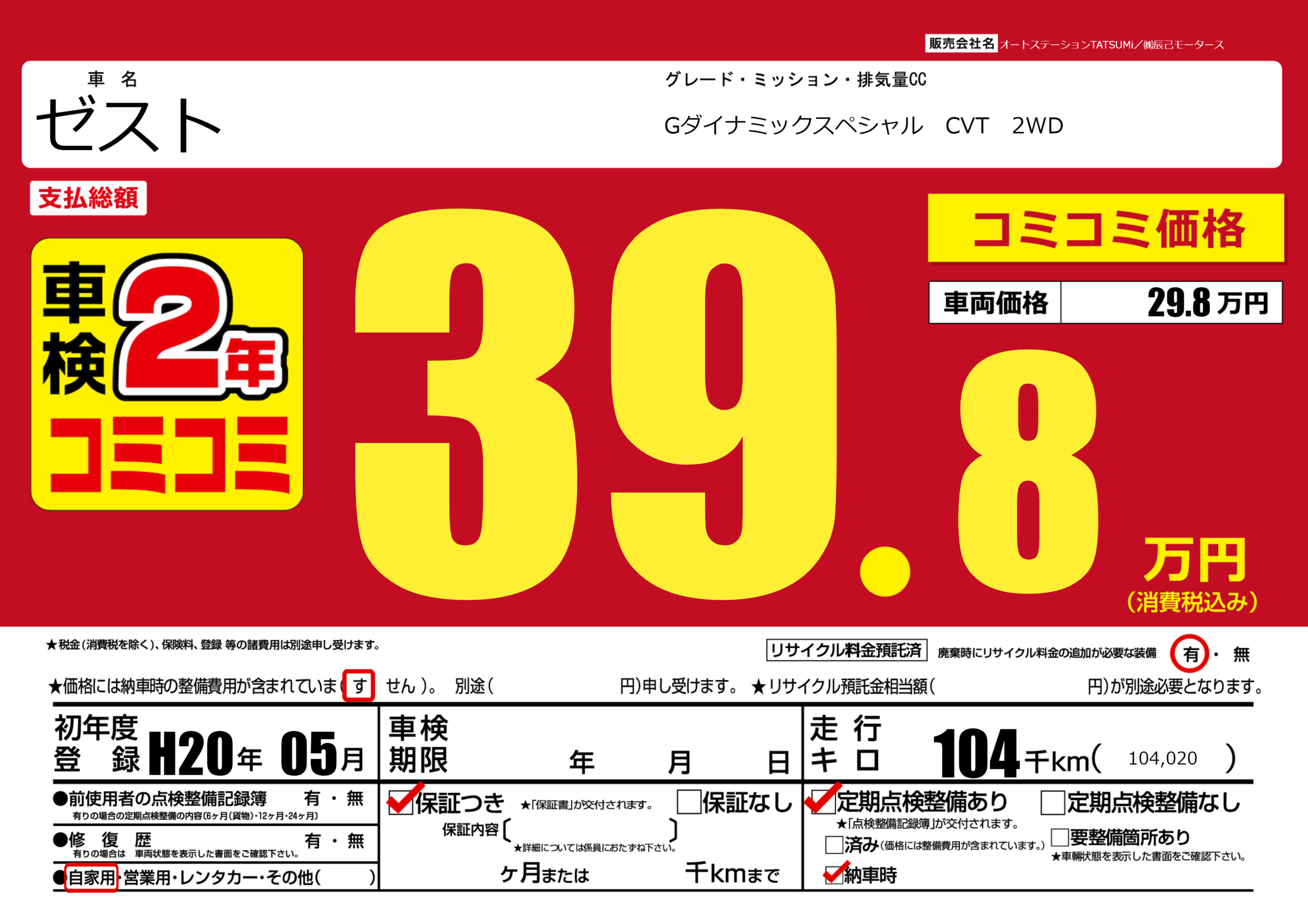 | 走行キロ | 10.4万km | 初年度登録 | H20年05月 |