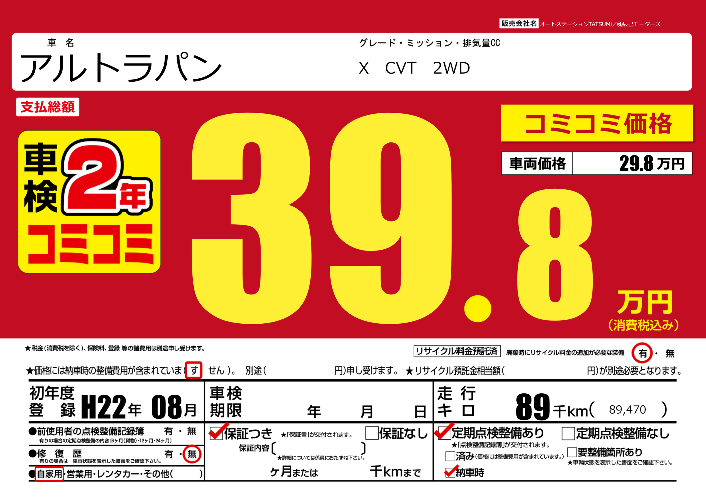 | 走行キロ | 8.9万km | 初年度登録 | H22年08月 |