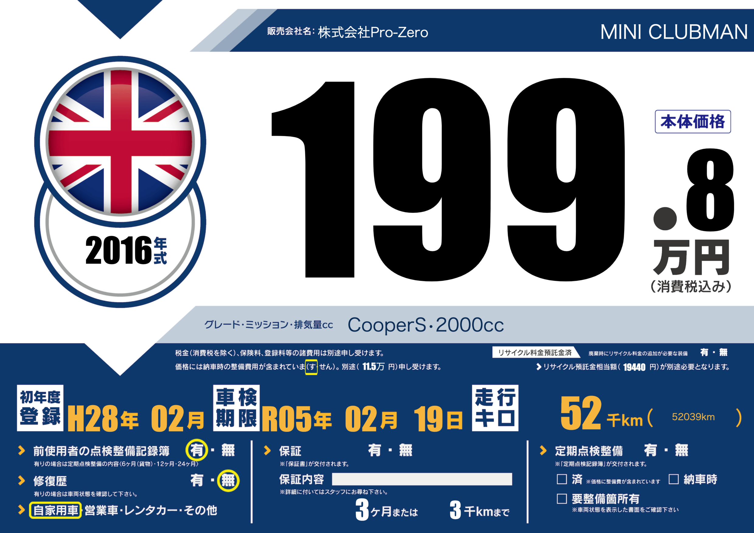 | 車名 | MINI CLUBMAN | グレード ミッション 排気量 |
