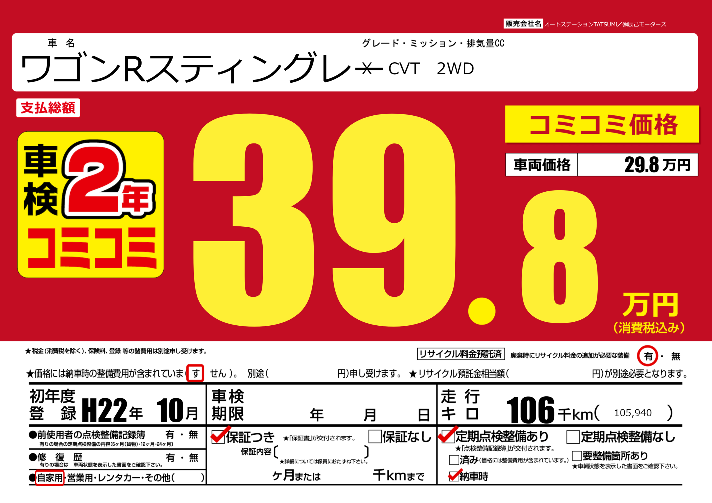 | 車名 | ワゴンRスティングレー | グレード ミッション 排気量 |