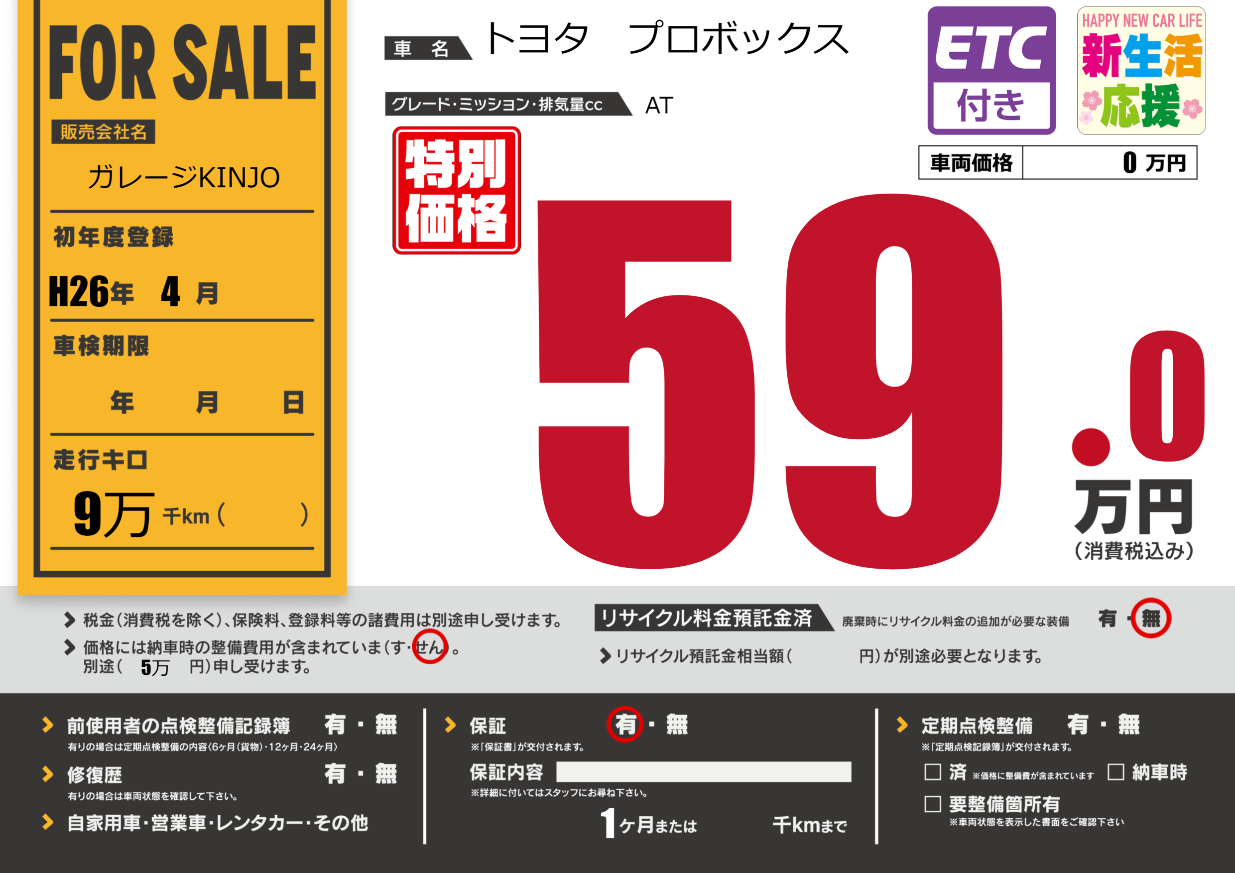 | 車名 | トヨタ プロボックス | グレード ミッション 排気量 |