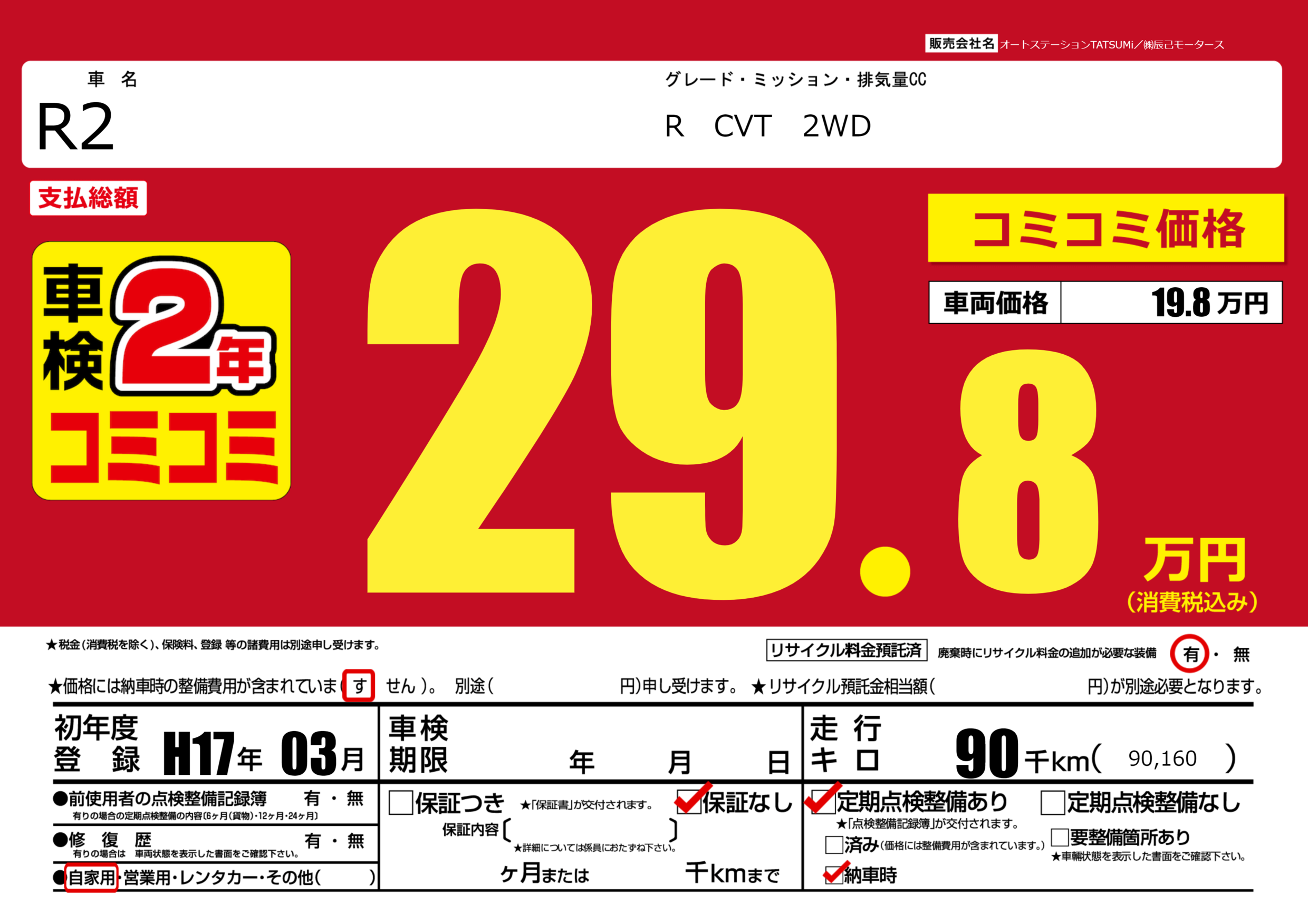 | 走行キロ | 9万km | 初年度登録 | H17年03月 |